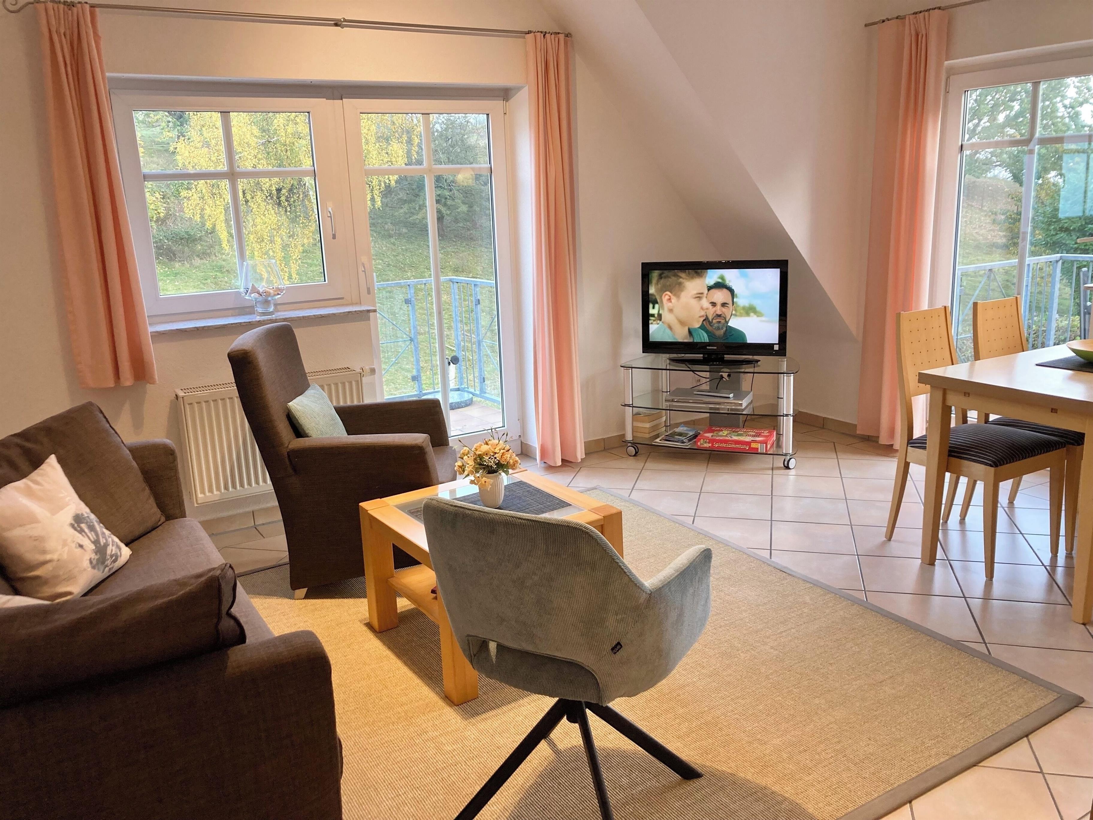 Die Wohnung verfügt über großzügige Wohnräume mit gemütlicher Sofaecke, Kabel-TV, DVD-Player und Stereoanlage, zwei separate Schlafzimmer mit Doppelbetten sowie einen zusätzlichen kleinen Abstellraum. Die separate, voll ausgestattete Küche lässt keine Wünsche offen - inklusive Cerankochfeld, Backofen, Mikrowelle, Geschirrspüler und allem, was Sie für genussvolle Urlaubstage benötigen. Ein komfortables Duschbad sowie ein separates WC sorgen für zusätzlichen Komfort.
