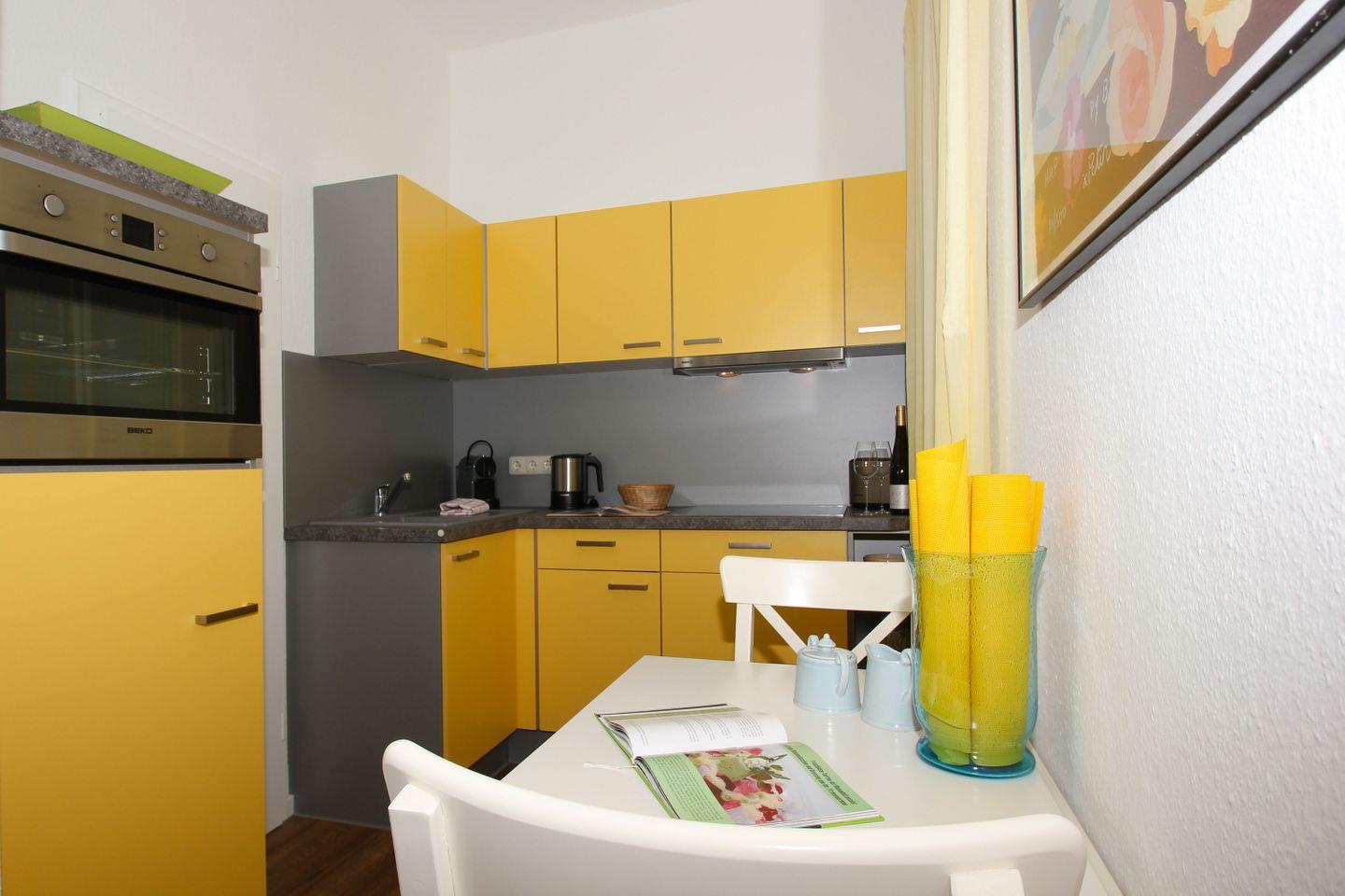 KÜCHE // Küchenzeile, 4-Felder Ceranfeld, Kühlschrank, Backofen, Toaster, Wasserkocher, Kaffeemaschine, reichlich Besteck, Geschirr und Küchenutensilien ++