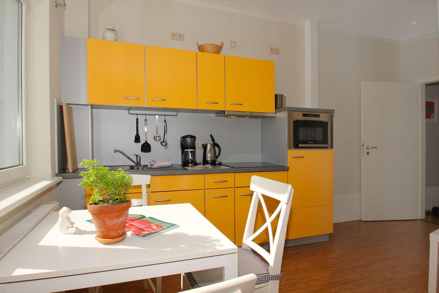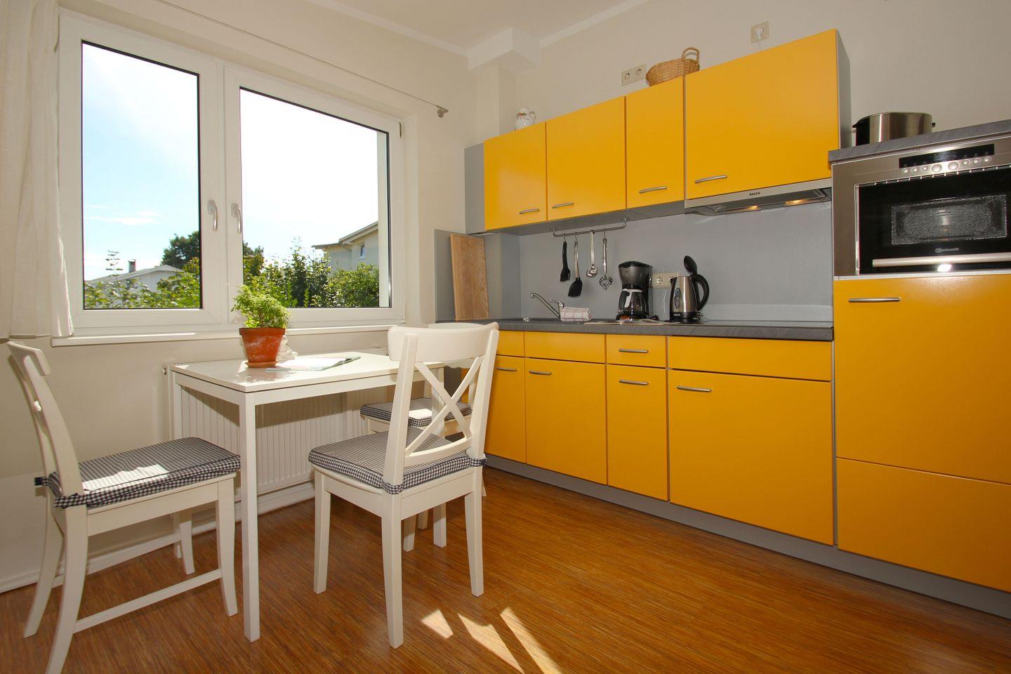 KÜCHE // Küchenzeile, 4-Felder Ceranfeld, Kühlschrank, Backofen, Toaster, Wasserkocher, Kaffeemaschine, reichlich Besteck, Geschirr und Küchenutensilien ++