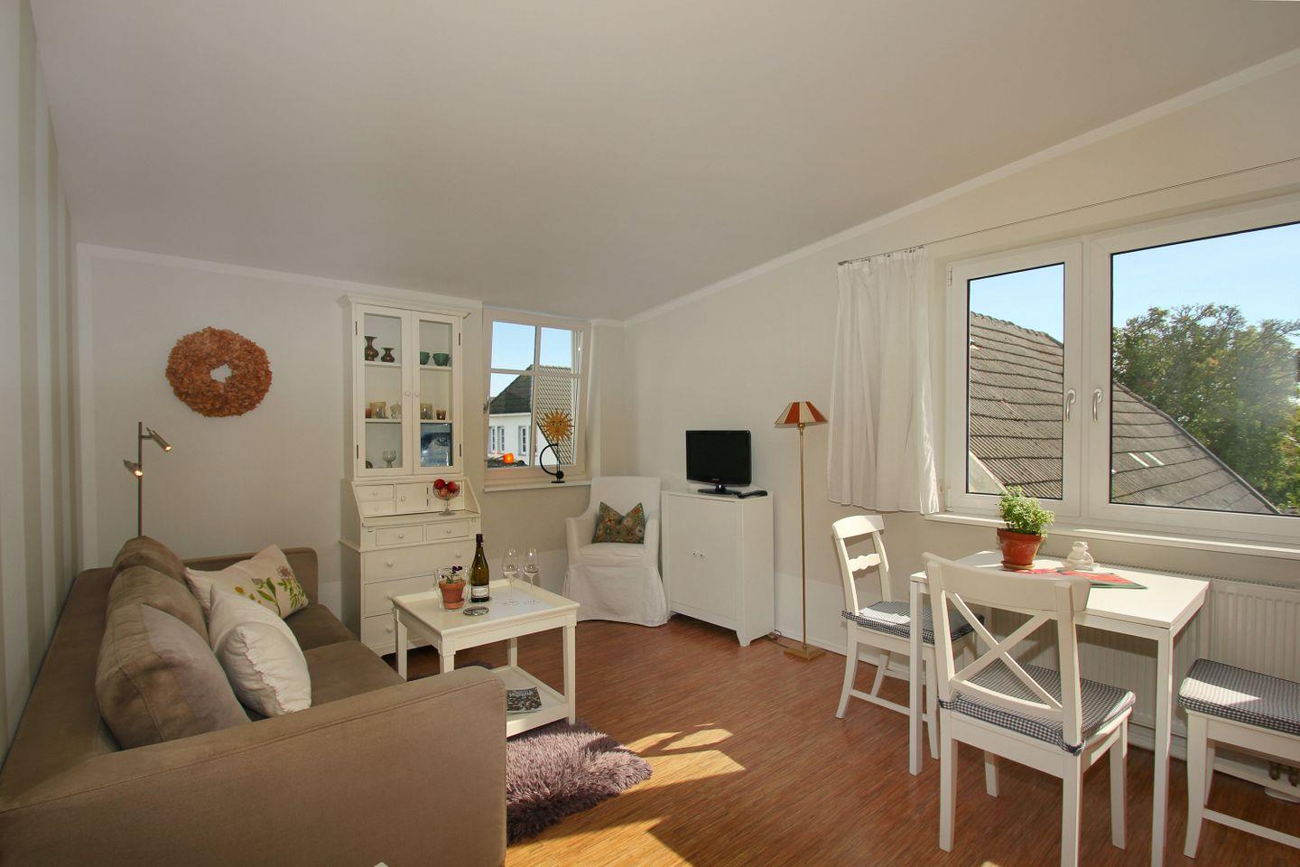 WOHNEN // Wohnraum mit Essbereich, Sitzgarnitur mit bequemer Schlafcouch, Flachbild-TV, Radio, CD-Player ++