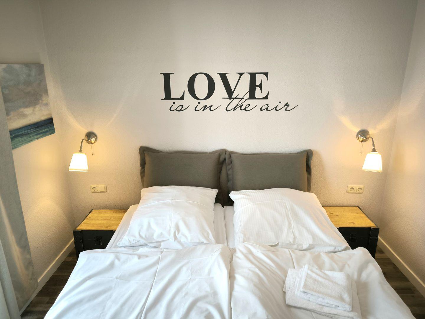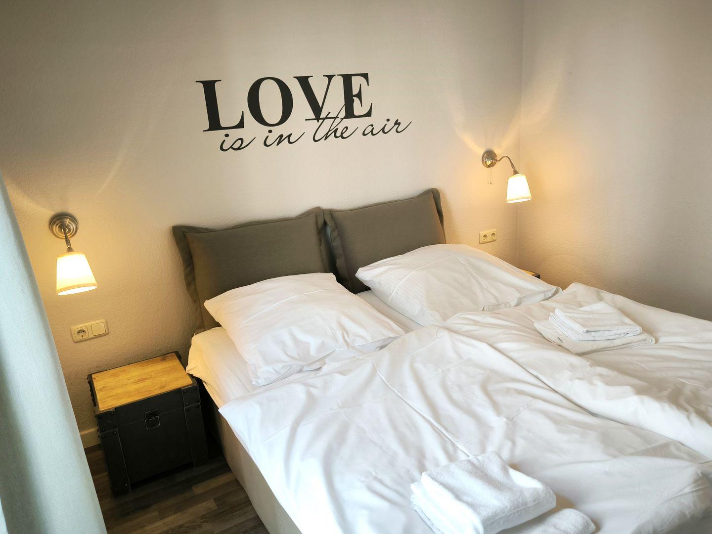Schlafzimmer mit bequemen Boxspringbett (1,60 m x 2,00 m), Nachttischablagen