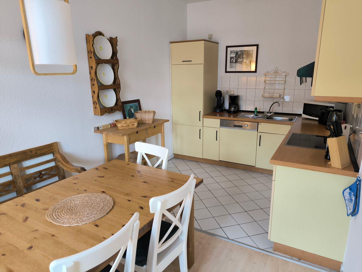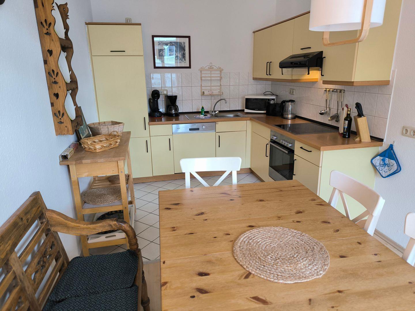 Wohnküche mit Backofen und Cerankochfeld, Kühlschrank mit Gefrierfach, Geschirrspüler, Toaster, Kaffeemaschine, Wasserkocher, Mikrowelle und diverse Küchenutensilien sowie ein Esstisch mit Sitzbank und Stühlen