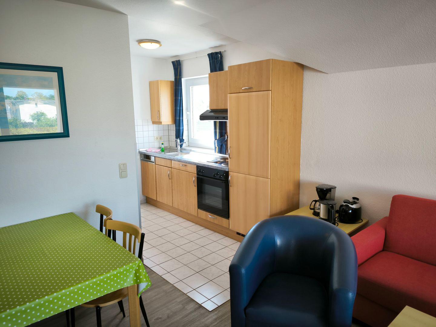 integrierte Einbauküche mit 4-Platten-Kochfeld, Backofen, Kühlschrank mit Gefrierfach, Geschirrspüler, Toaster, Kaffeemaschine, Wasserkocher und Küchenutensilien