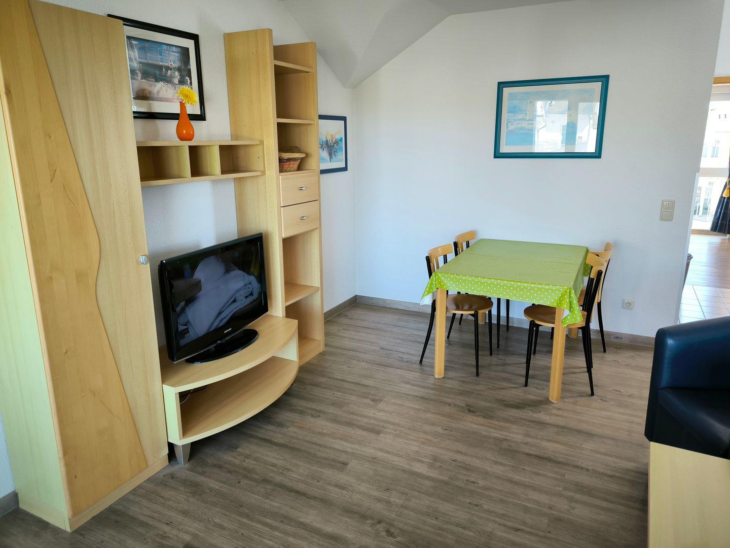 Wohnbereich mit ausziehbarer Doppelbettschlafcouch (170 x 200 cm), 2 Sesseln, Couchtisch, TV mit Radiofunktion und Esstisch mit 4 Stühlen
