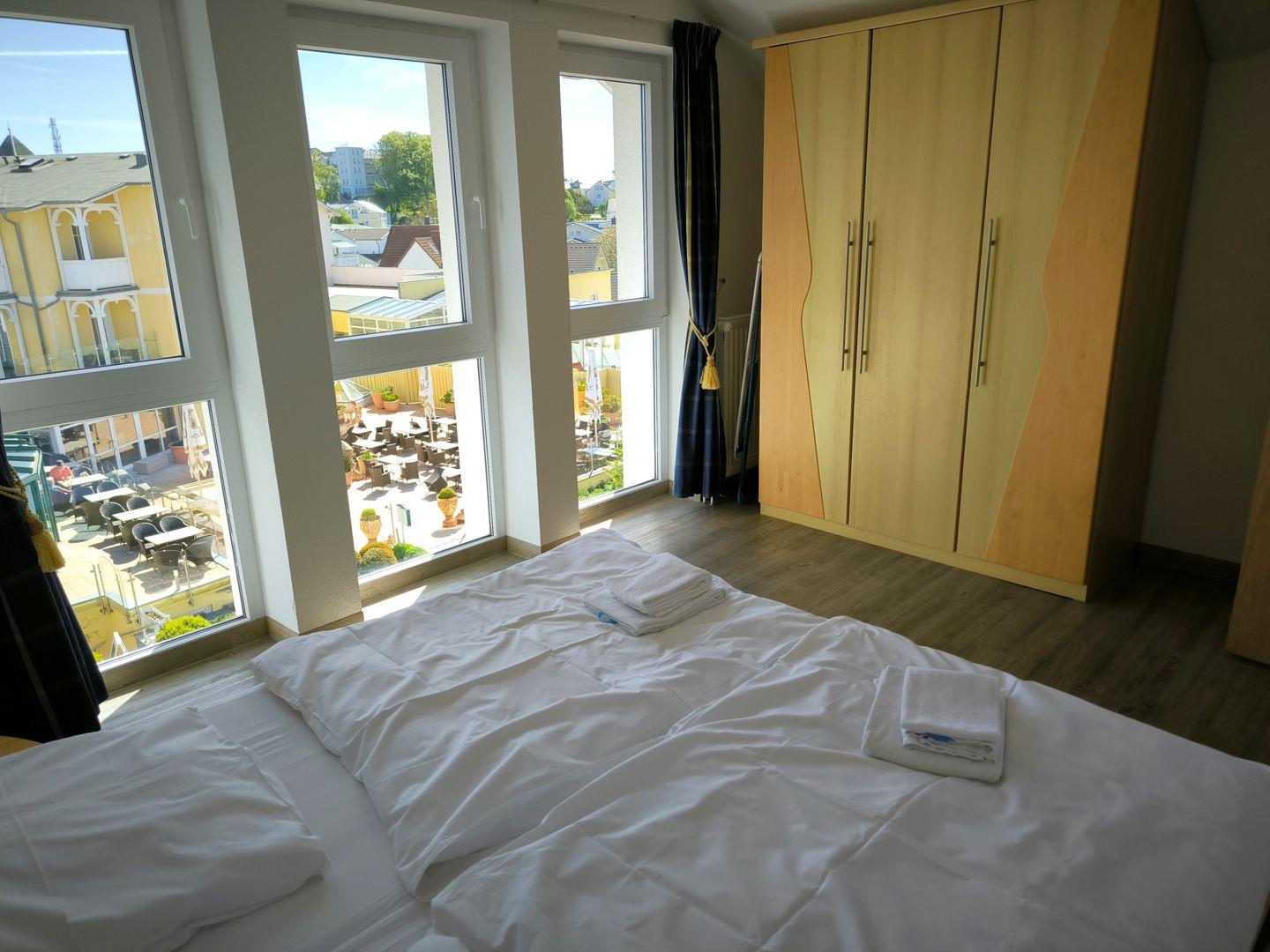 Schlafzimmer mit einem Doppelbett (180 x 200 cm) und großem Kleiderschrank