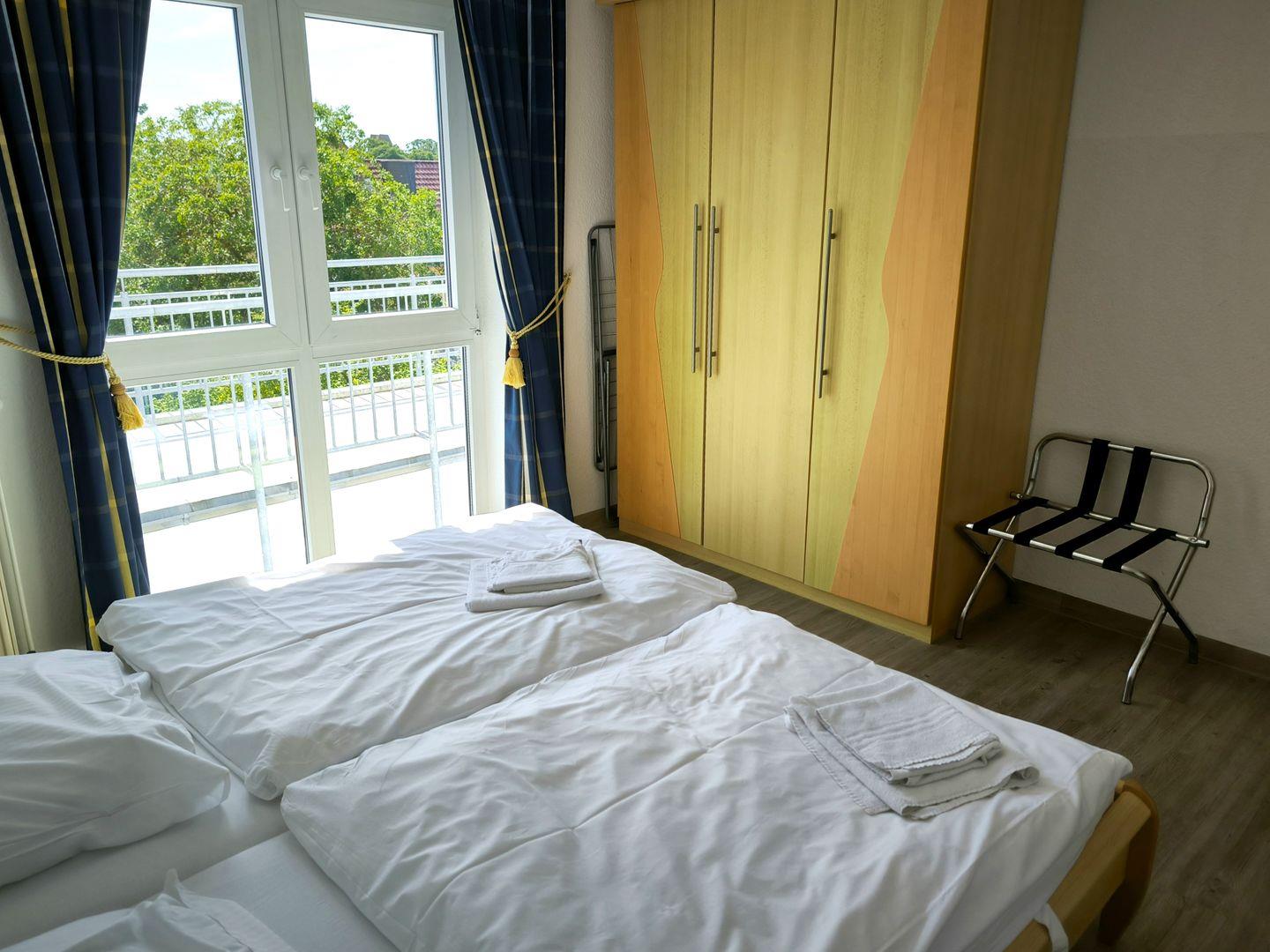 Schlafzimmer mit 2 Einzelbetten (90 x 200 cm ), großem Kleiderschrank, Tisch und Stühlen