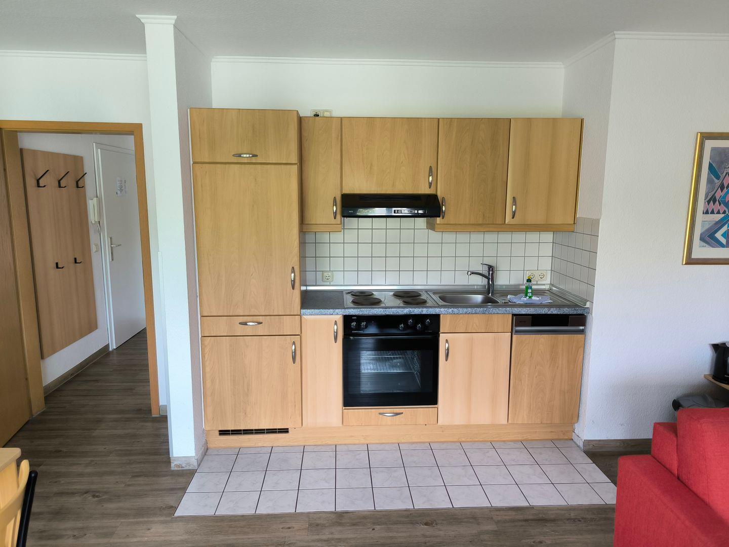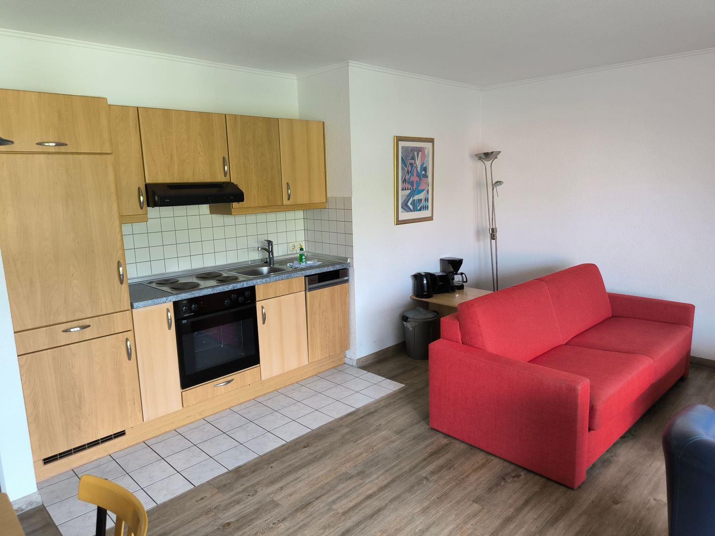 Im Wohnraum integrierte Einbauküche, ausgestattet mit: 4- Platten- Kochfeld, Backofen, Kühlschrank, Geschirrspüler, Toaster, Kaffeemaschine, Wasserkocher und Küchenutensilien
