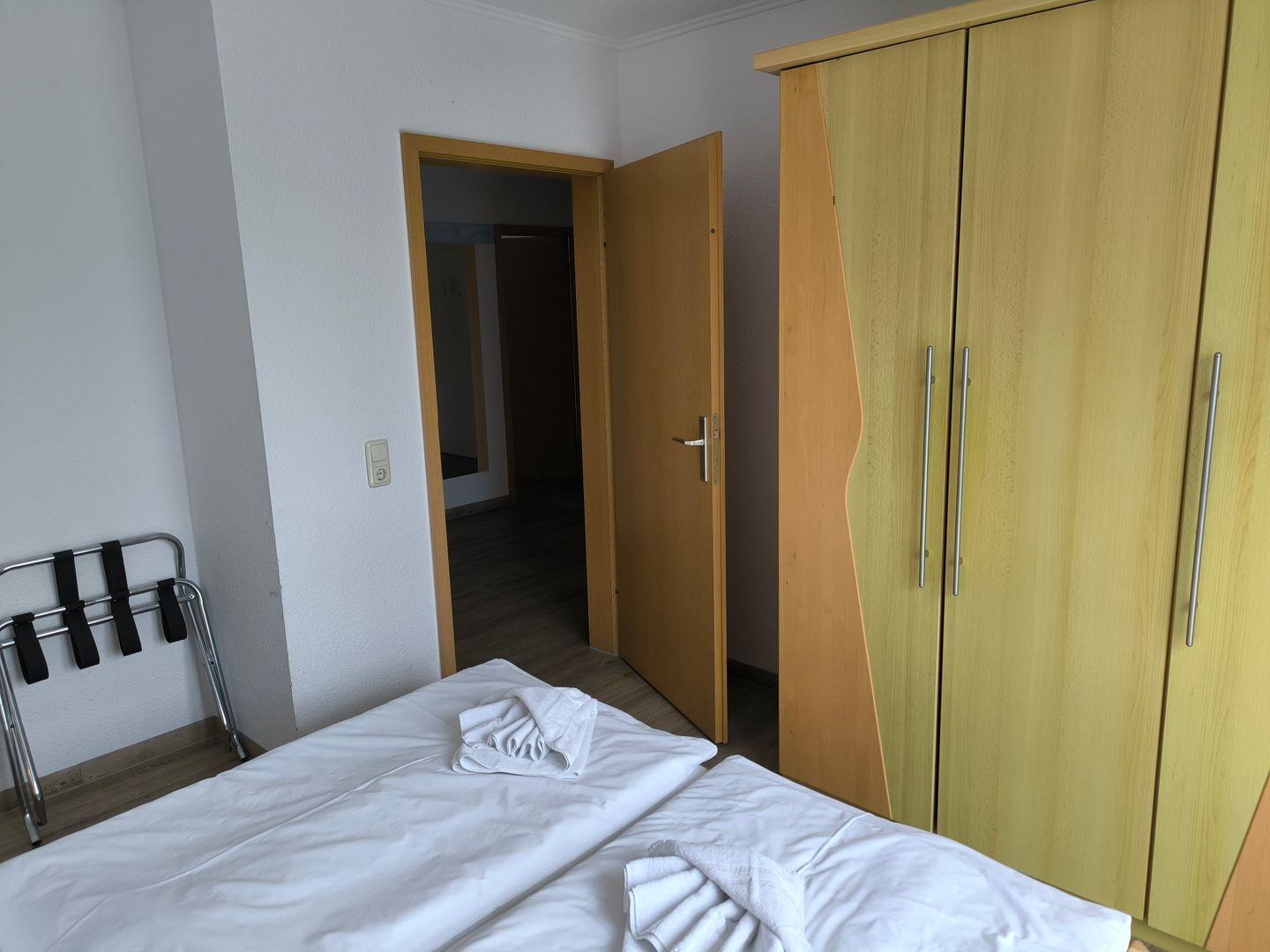 Schlafzimmer mit 2 Einzelbetten (90 x 200 cm ), großem Kleiderschrank, Tisch und Stühlen