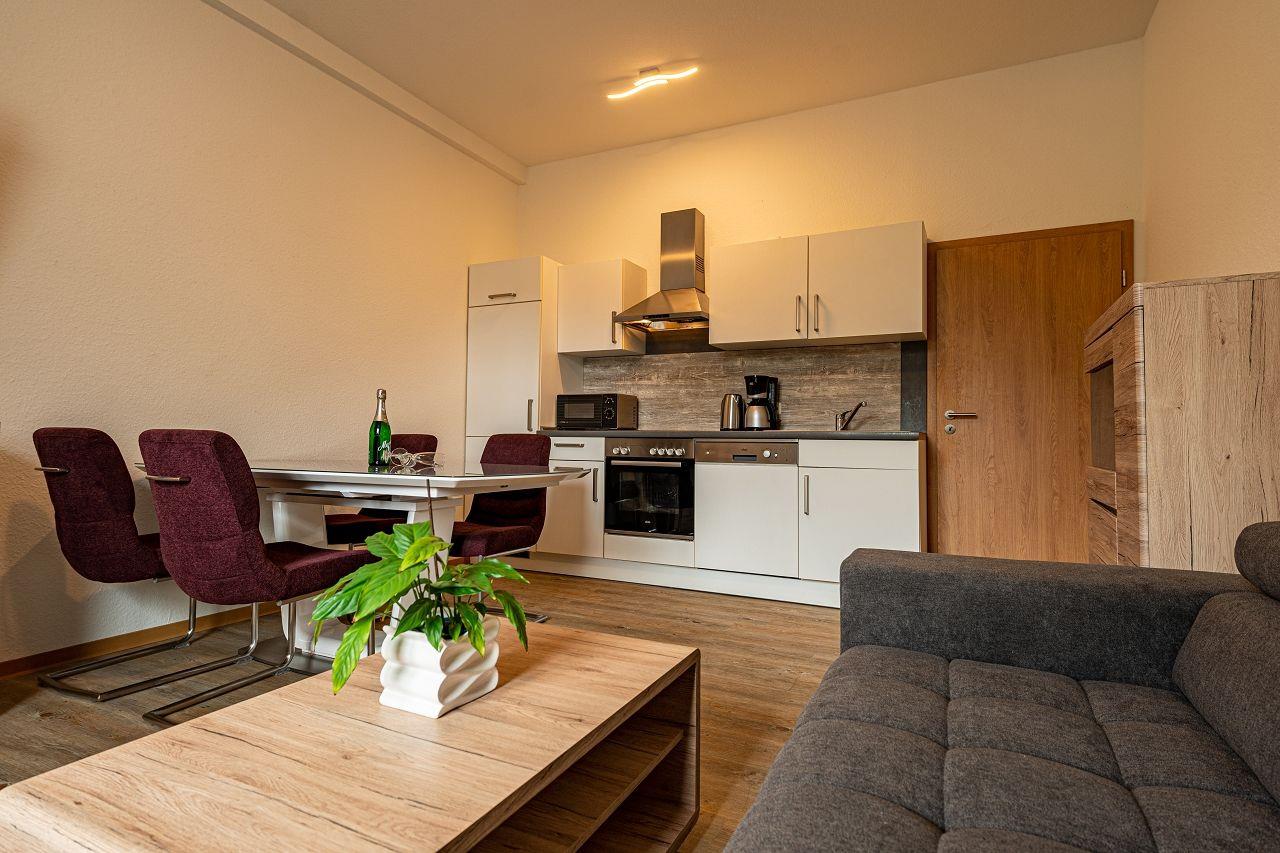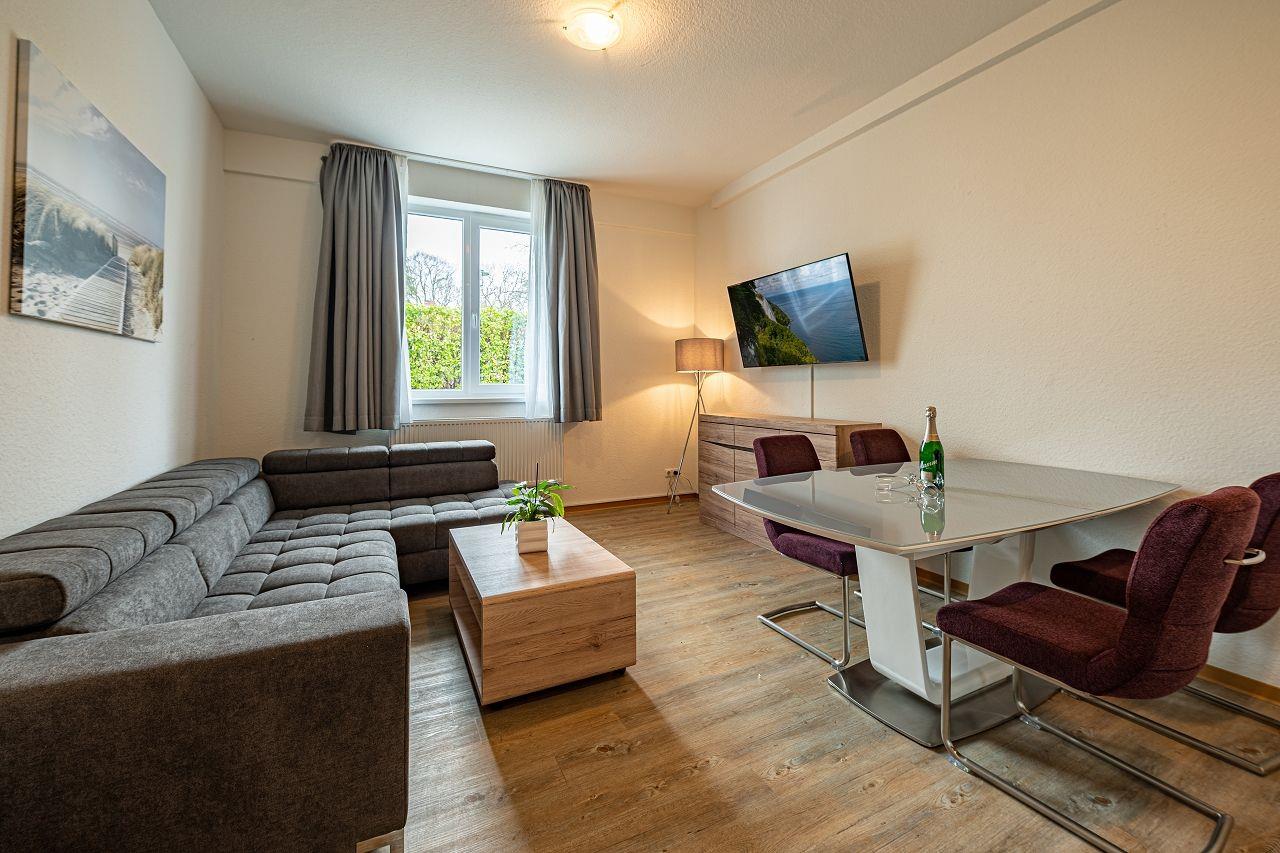 Wohnbereich mit moderner Wohnlandschaft, Couchtisch, TV (integr. Radio) und Esstisch mit 4 Stühlen