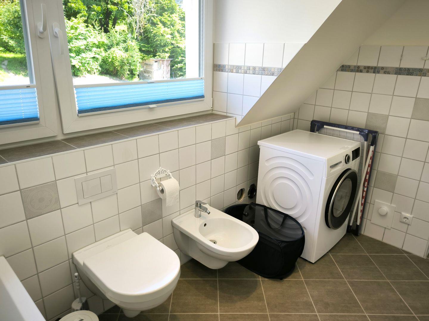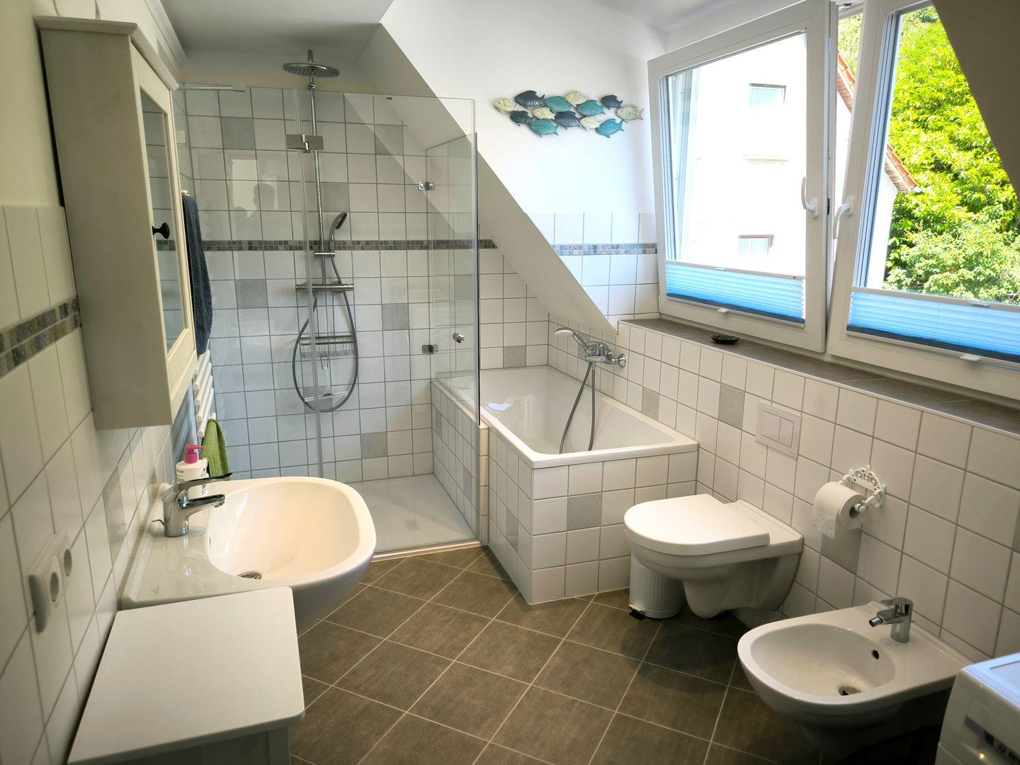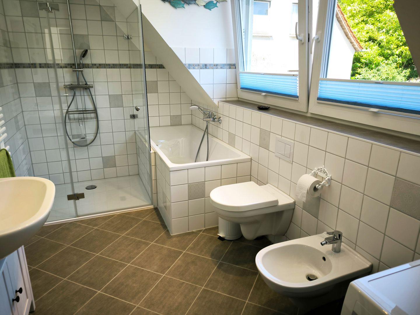 Bad mit großer ebenerdiger Dusche, Badewanne, Bidet, WC, Föhn und Waschtrockner