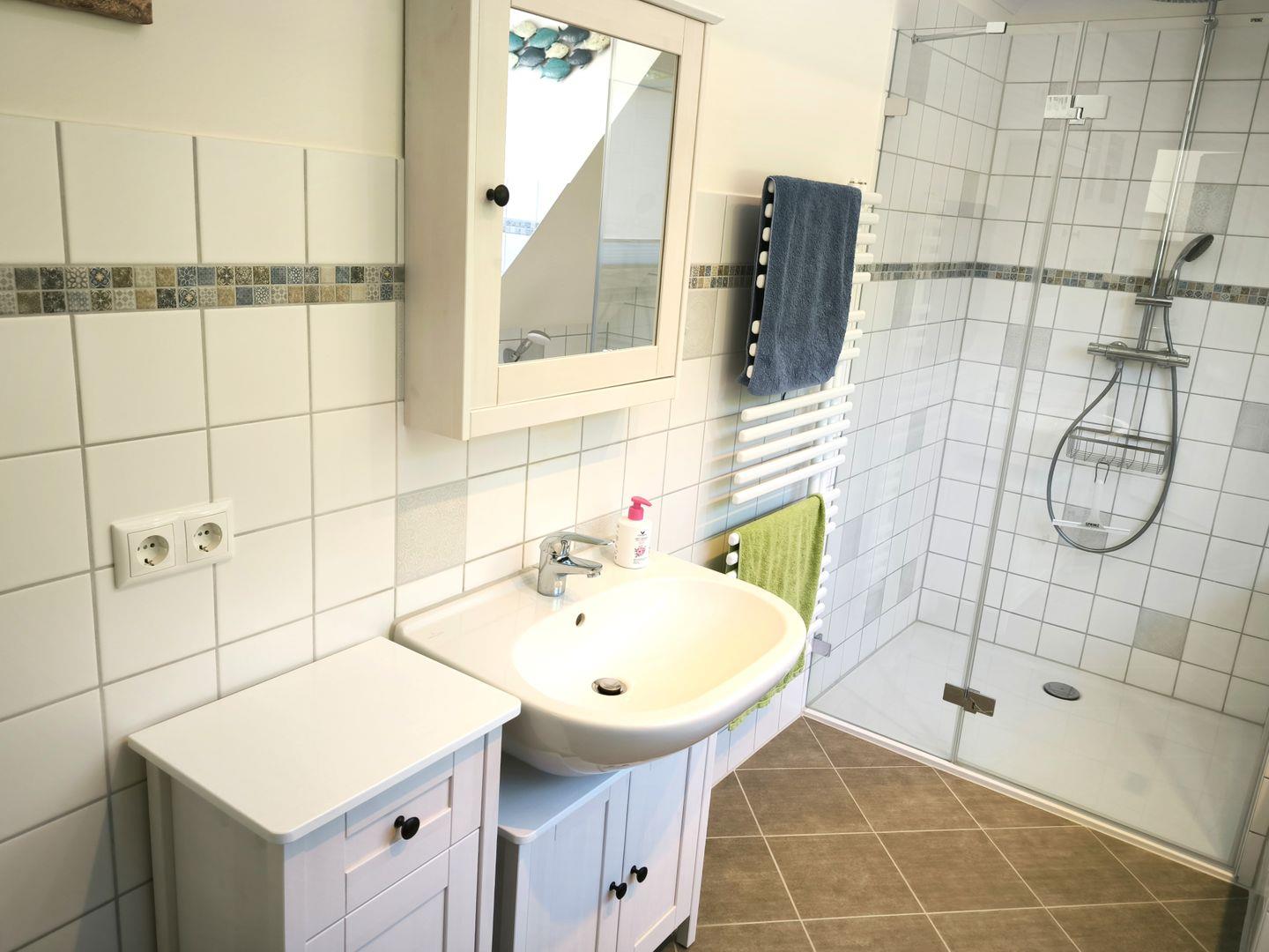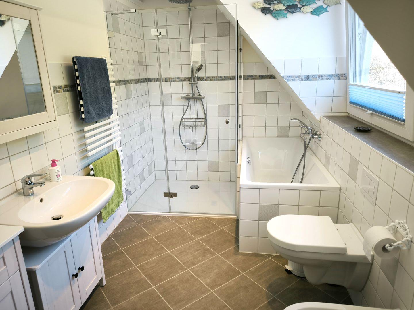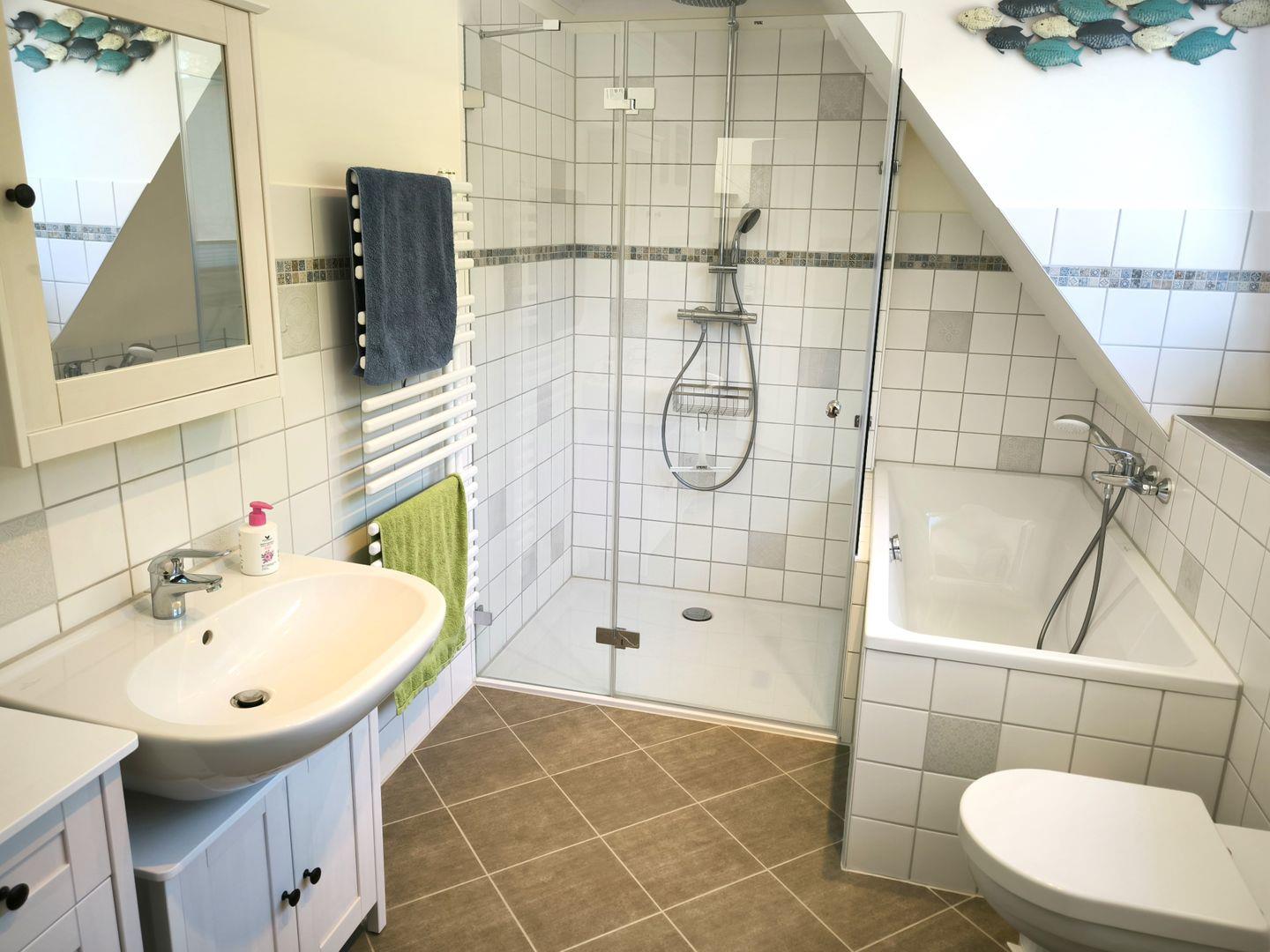 Bad mit großer ebenerdiger Dusche, Badewanne, Bidet, WC, Föhn und Waschtrockner