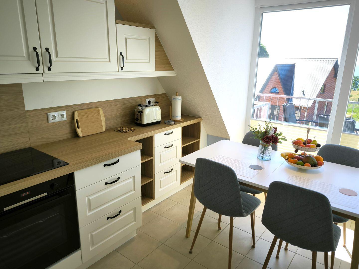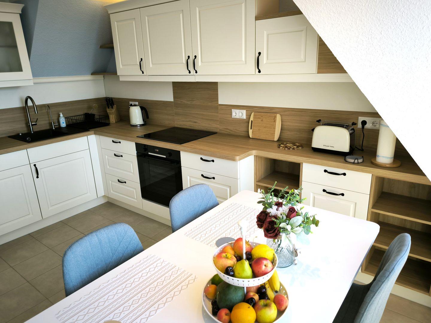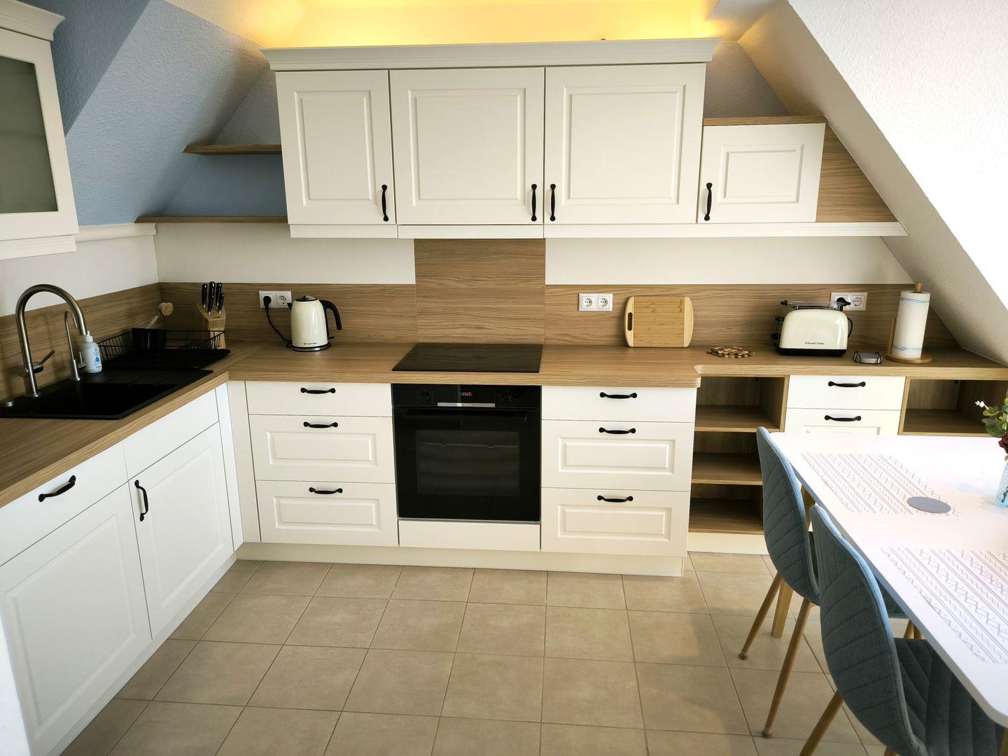 große Küche mit Induktionskochfeld, Backofen, großer Kühl- Gefrierkombination, Geschirrspüler, Toaster, Kaffeemaschine, Wasserkocher und hochwertigen Küchenutensilien, Osmose-Trinkwasser-Filteranlage