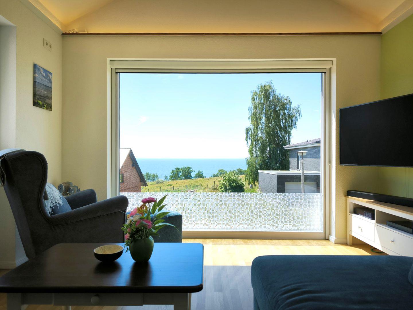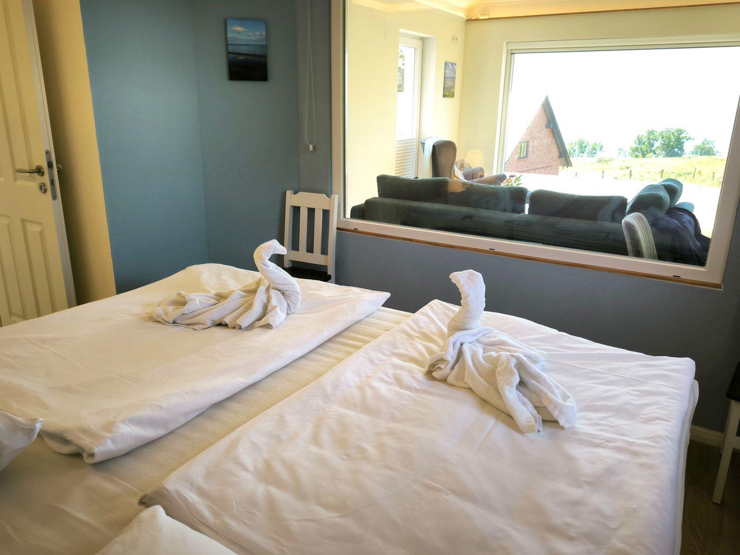 vom Schlafzimmer Meerblick durch innenliegendes Fenster zum Wohnzimmer