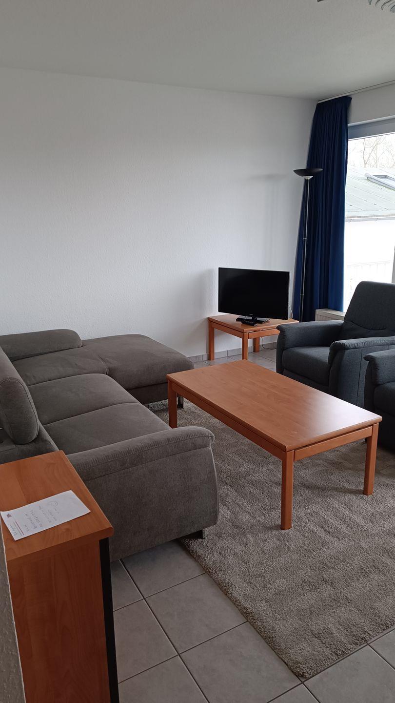 Wohnbereich mit 2 Couchen, Couchtisch, Anrichte, Flat-TV, Radio und Esstisch mit 4 Stühlen