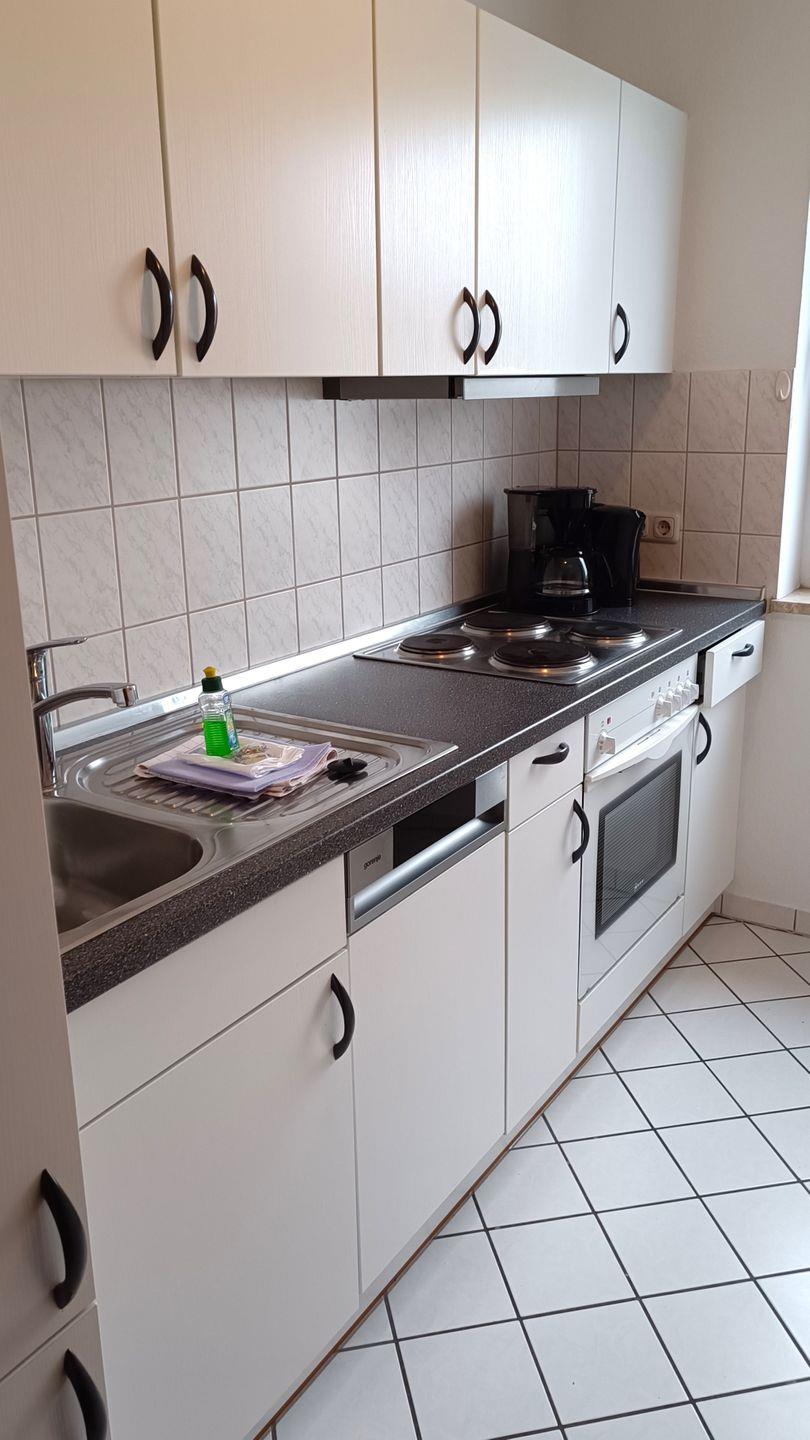 Küche ausgestattet mit: 4- Platten-Kochfeld, Backofen, Dunstabzugshaube, Kühlschrank mit Gefrierfach, Geschirrspüler, Toaster, Kaffeemaschine, Wasserkocher und Küchenutensilien
