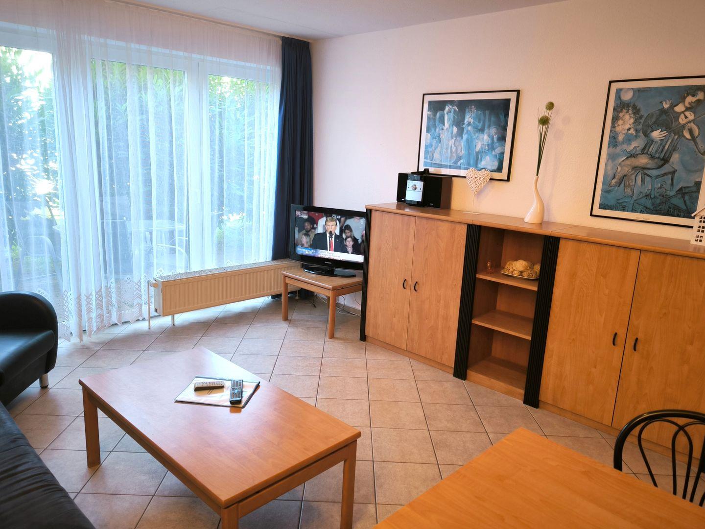 Wohnbereich mit ausziehbarer, moderner Doppelbettschlafcouch (150 x 200 cm), 2 Sesseln, Couchtisch, Anrichte, Flat-TV, CD-Radio-Anlage und Esstisch mit 4 Stühlen