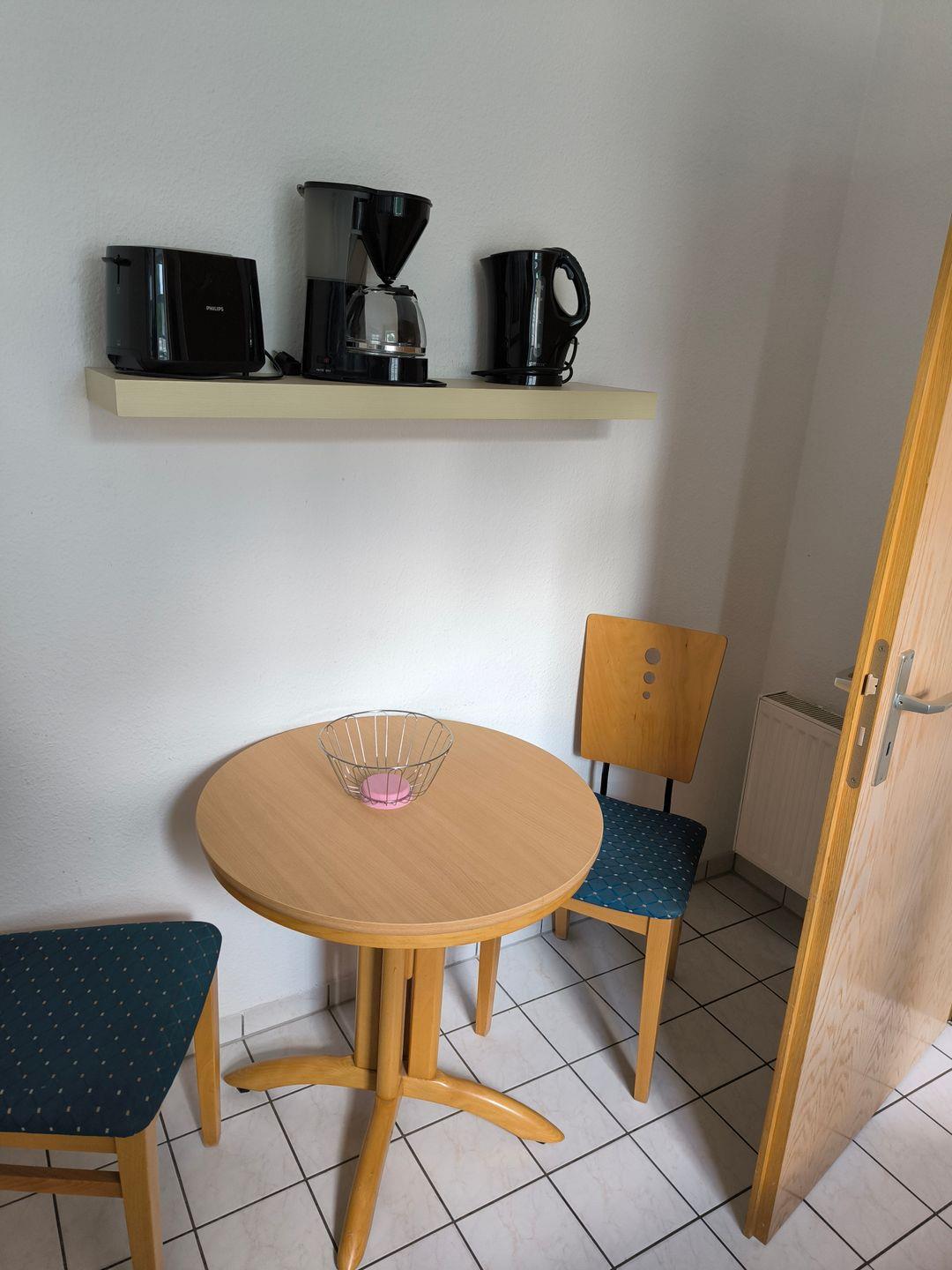 Küche mit : 2-Platten-Kochfeld, Mikrowelle, Dunstabzugshaube, Kühlschrank mit Gefrierfach, Geschirrspüler, Toaster, Kaffeemaschine, Wasserkocher und Küchenutensilien, kleiner Tisch mit 2 Stühlen