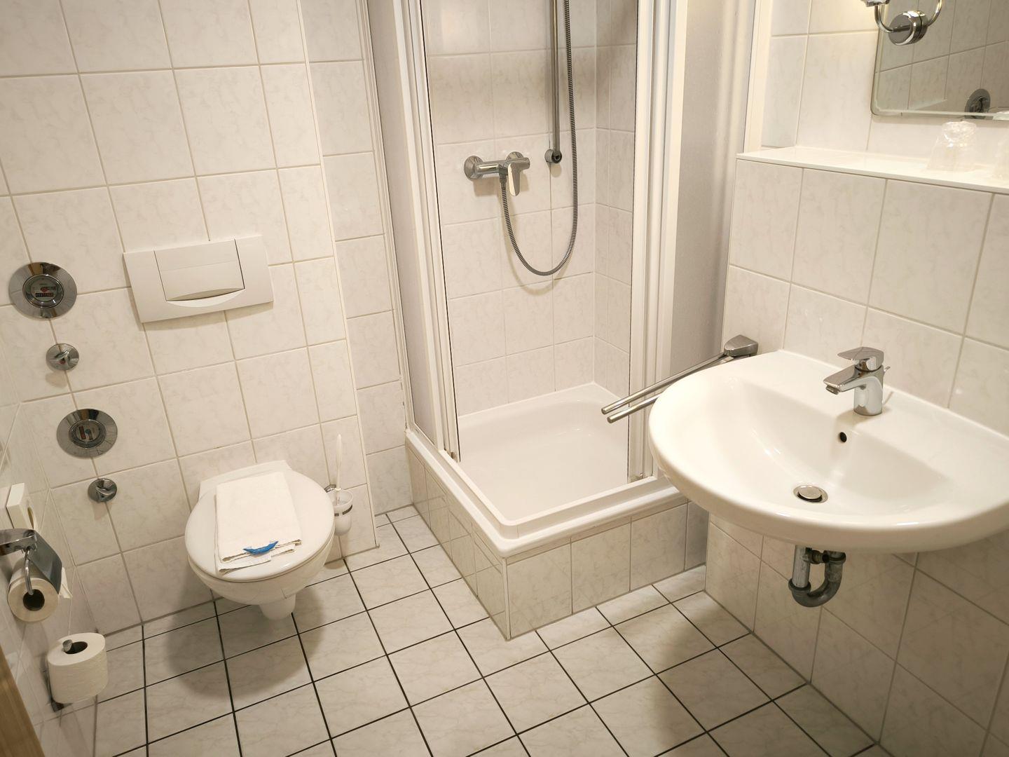 Bad mit Dusche, WC, Föhn und beleuchtetem Kosmetikspiegel