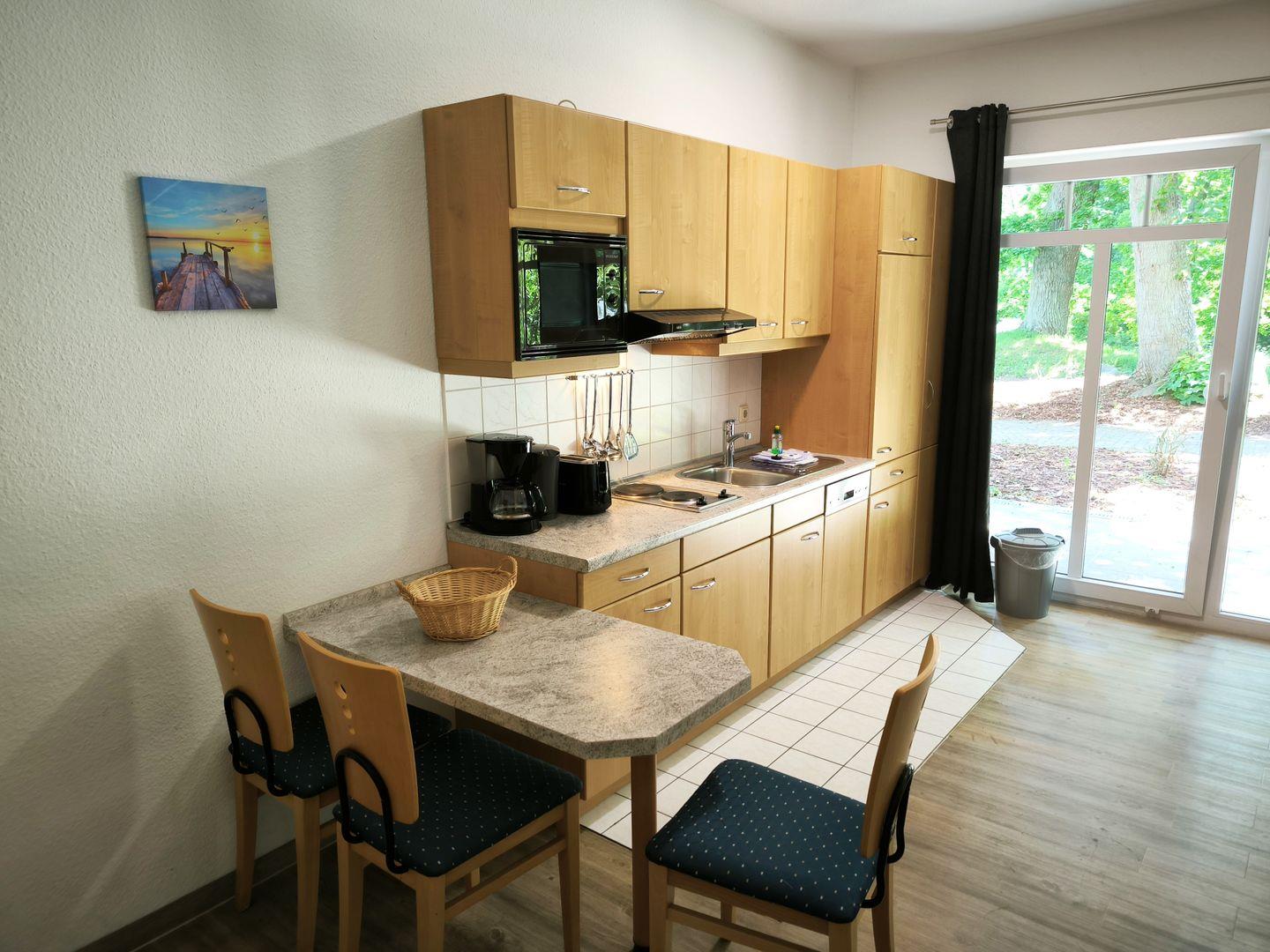 Im Wohnraum integrierte Einbauküche, ausgestattet mit: 2-Platten-Kochfeld, Mikrowelle, Dunstabzugshaube, Kühlschrank mit Gefrierfach, Geschirrspüler, Toaster, Kaffeemaschine, Wasserkocher und Küchenutensilien