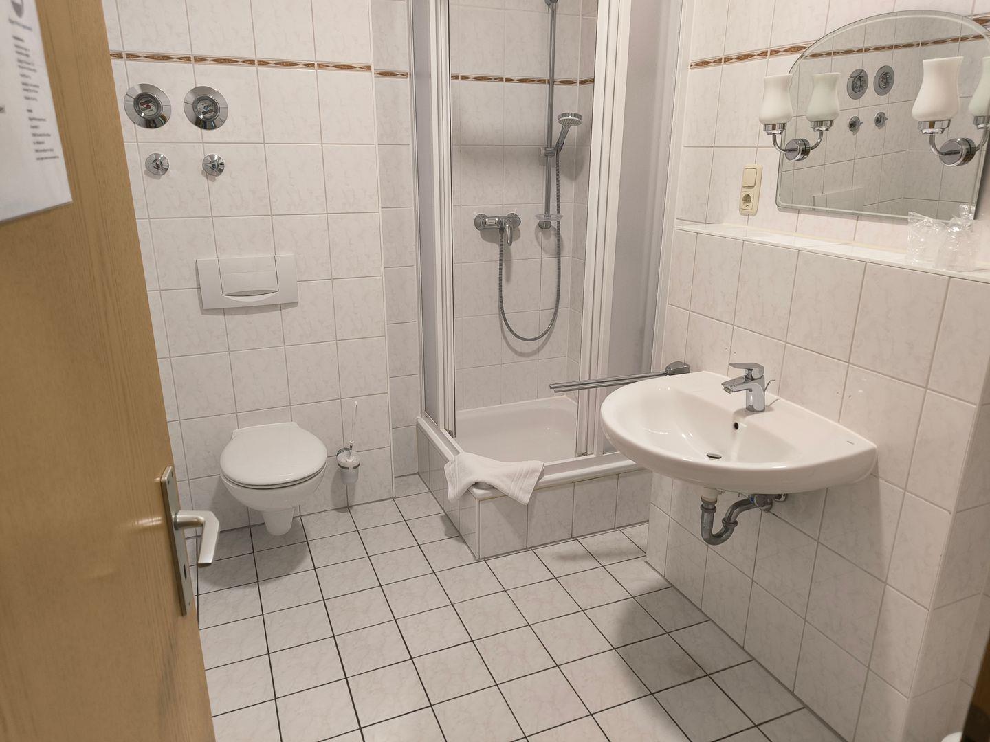 Bad mit Dusche, WC, Föhn und beleuchtetem Kosmetikspiegel