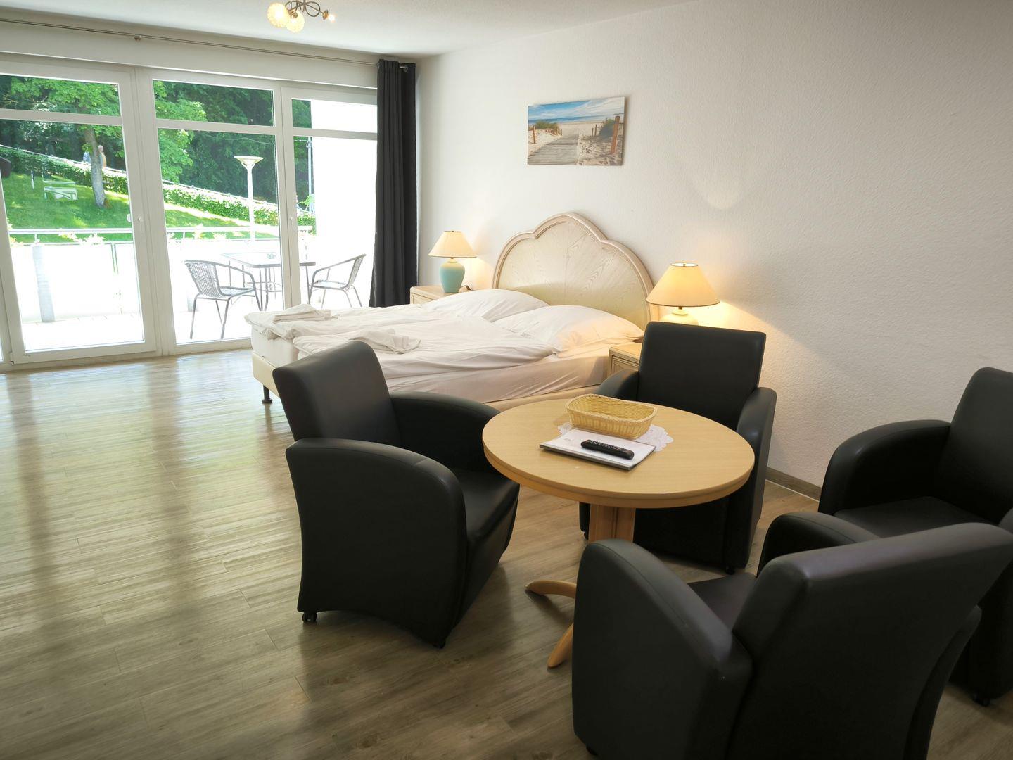 kombinierter Wohn-/Schlafraum mit Doppelbett (180 x 200 cm), Nachttischen, großem Kleiderschrank, Tisch mit 2 Ledersesseln, Anrichte mit TV, Kofferablage