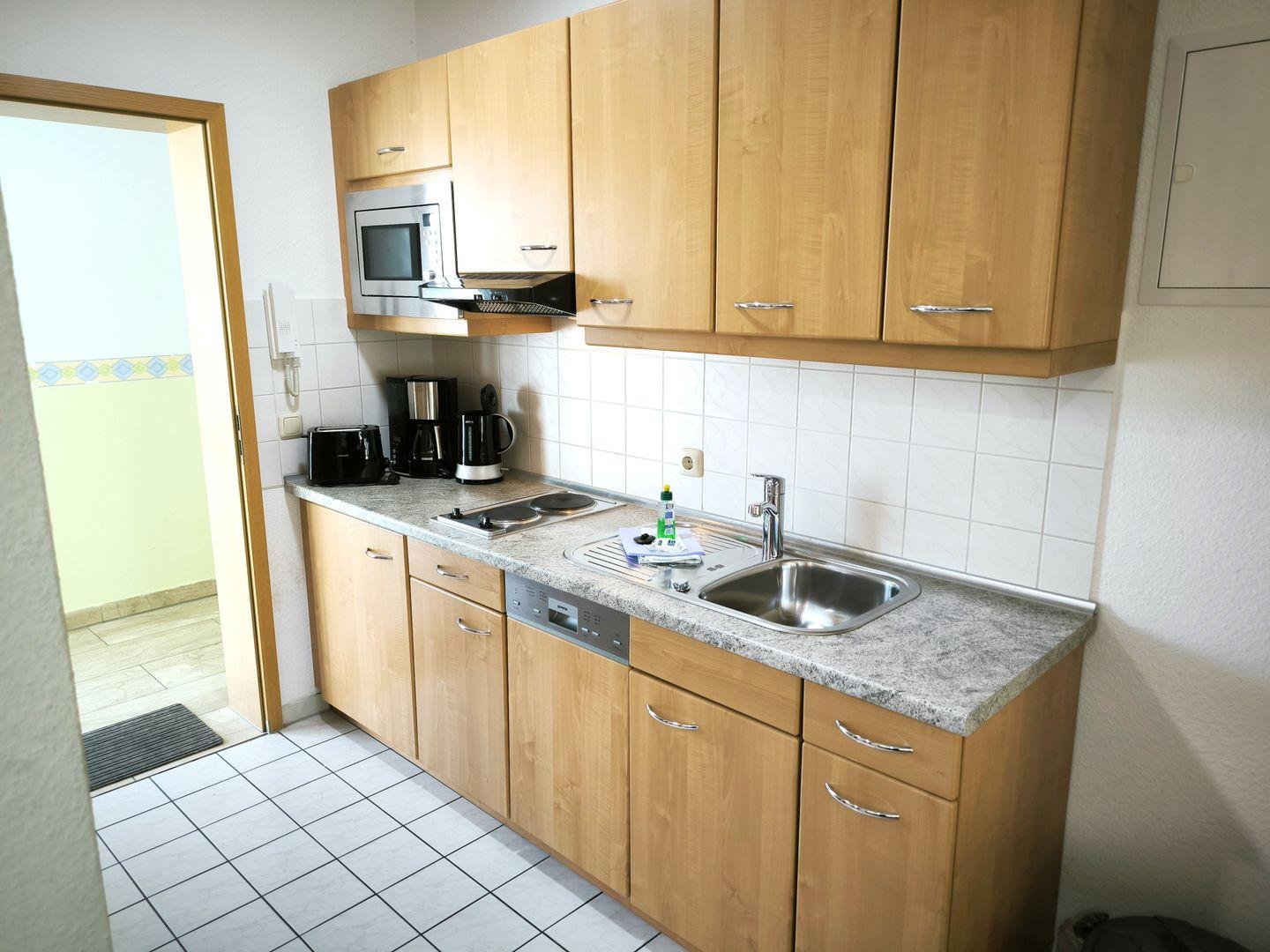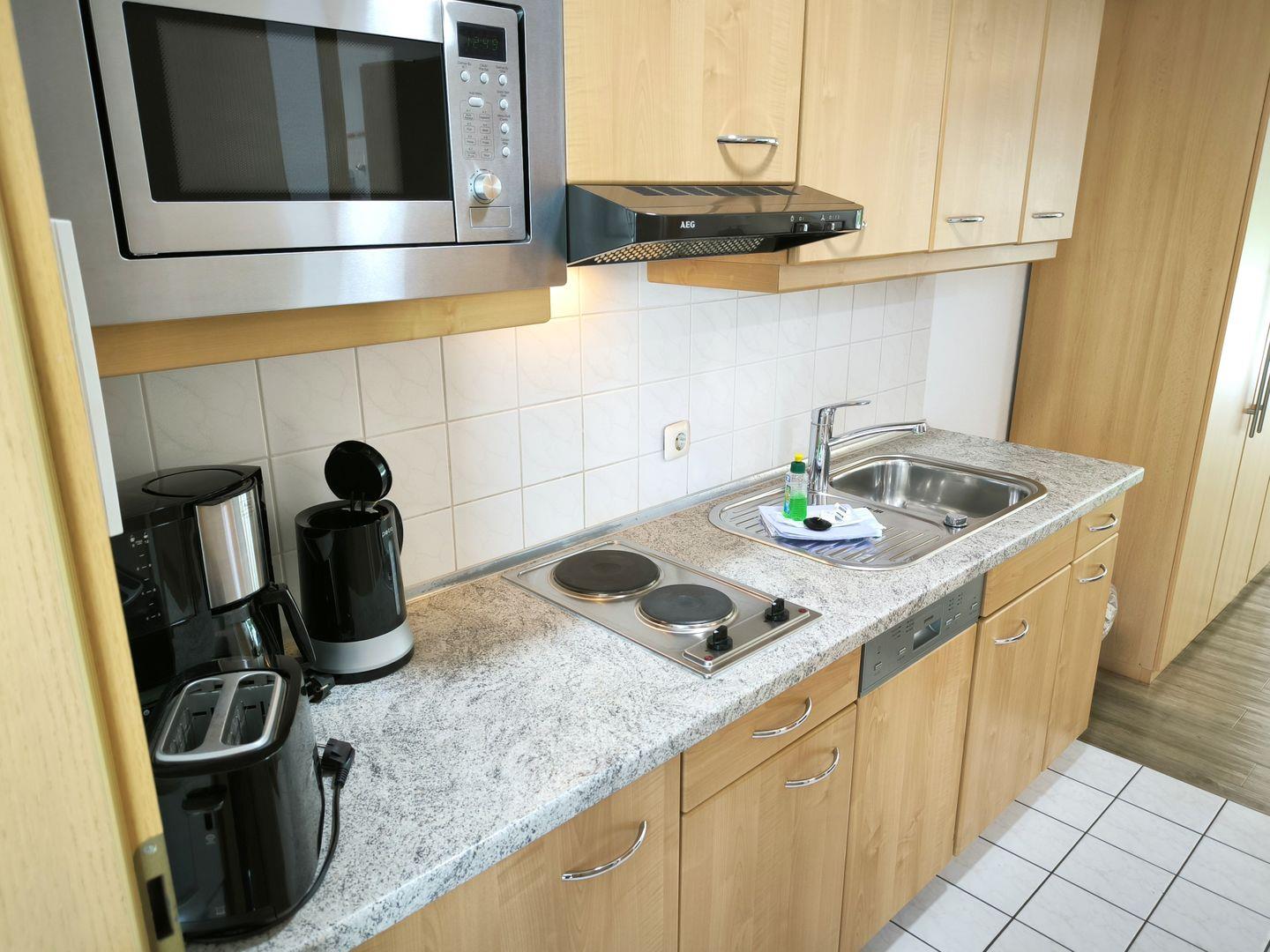 Im Wohnraum integrierte Einbauküche, ausgestattet mit: 2-Platten-Kochfeld, Mikrowelle, Dunstabzugshaube, Kühlschrank mit Gefrierfach, Geschirrspüler, Toaster, Kaffeemaschine, Wasserkocher und Küchenutensilien