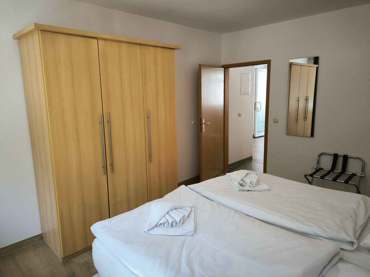 Schlafzimmer mit Doppelbett (180 x 200 cm), Nachttischen, großem Kleiderschrank, Kofferablage
