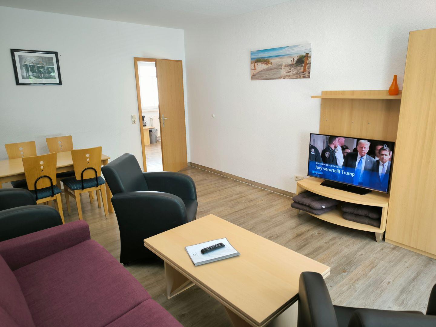 offenes Wohnzimmer mit Couch und Couchtisch sowie 2 Ledersesseln, Anrichte mit TV,