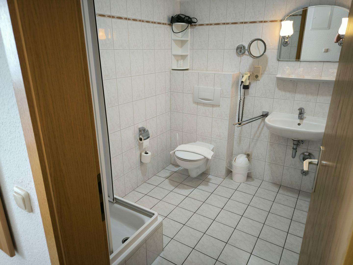 Bad mit Dusche, WC, Föhn und beleuchtetem Kosmetikspiegel