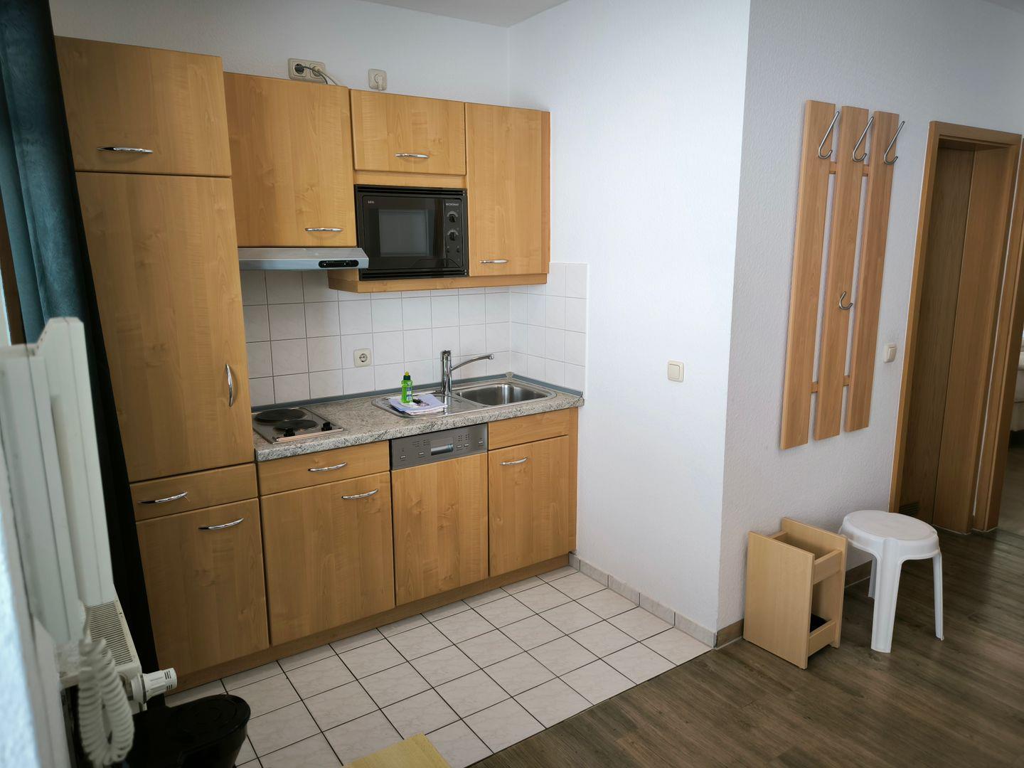Im Wohnraum integrierte Einbauküche, ausgestattet mit: 2-Platten-Kochfeld, Mikrowelle, Dunstabzugshaube, Kühlschrank mit Gefrierfach, Geschirrspüler, Toaster, Kaffeemaschine, Wasserkocher und Küchenutensilien