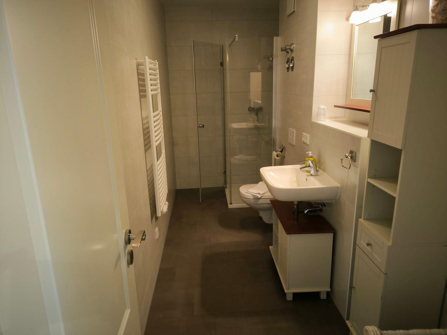 Bad mit großer ebenerdiger Dusche, WC und Föhn