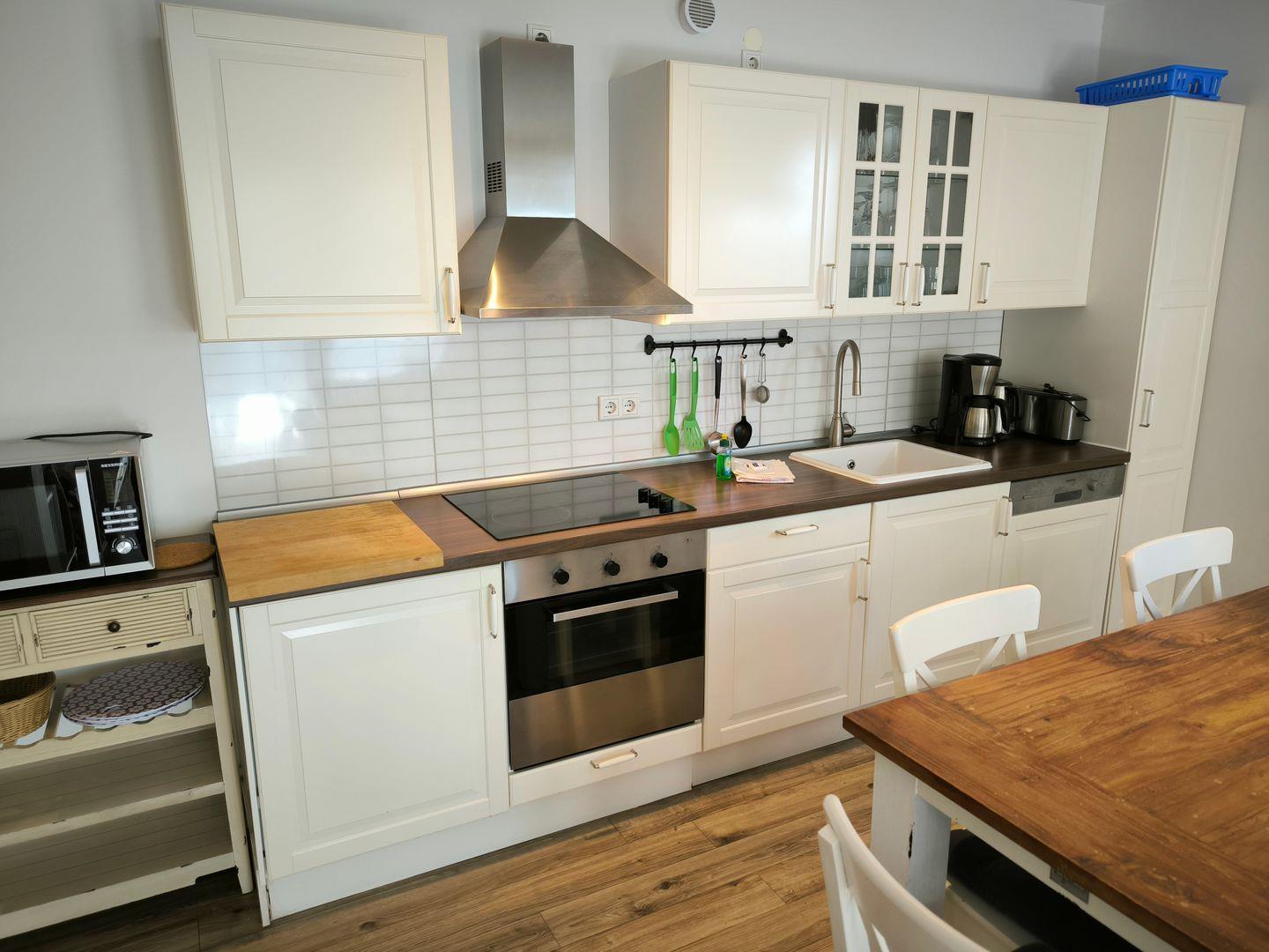 integrierte Einbauküche, ausgestattet mit 4-Platten-Cerankochfeld, Backofen , Mikrowelle, Kühlschrank mit Gefrierfach, Geschirrspüler, Toaster, Kaffeemaschine, Wasserkocher, und Küchenutensilien