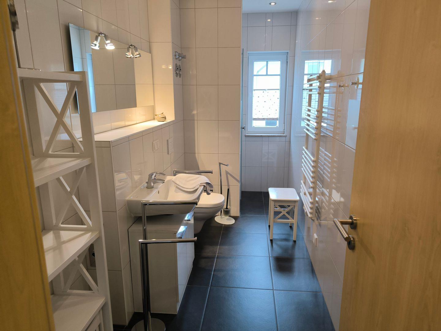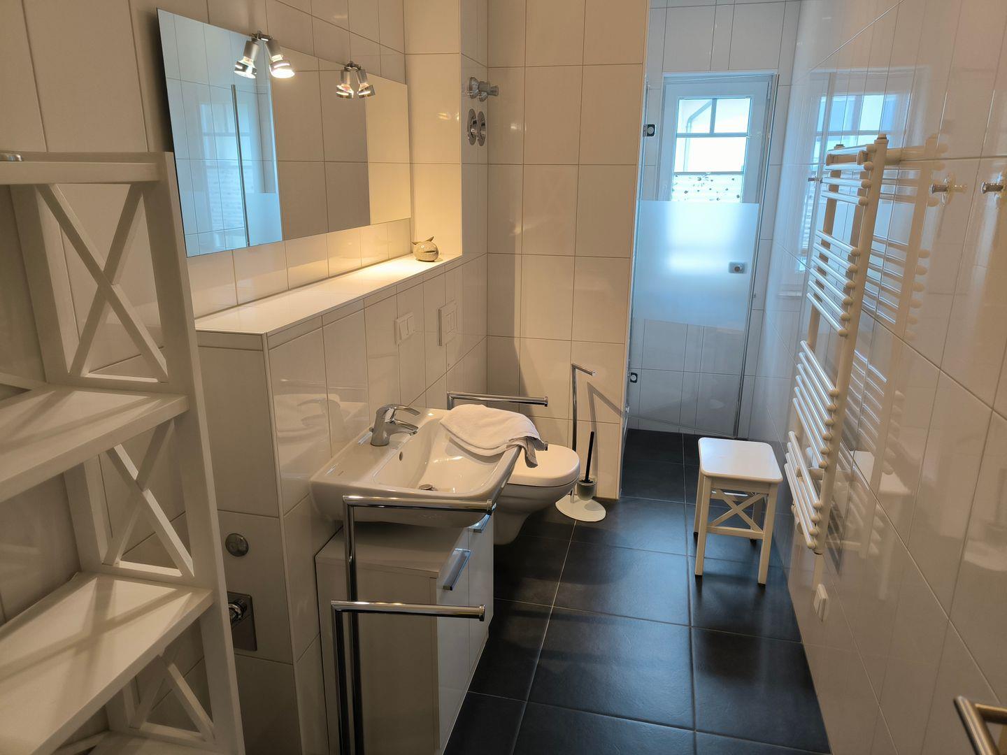 Bad mit großer ebenerdiger Dusche, WC und Föhn
