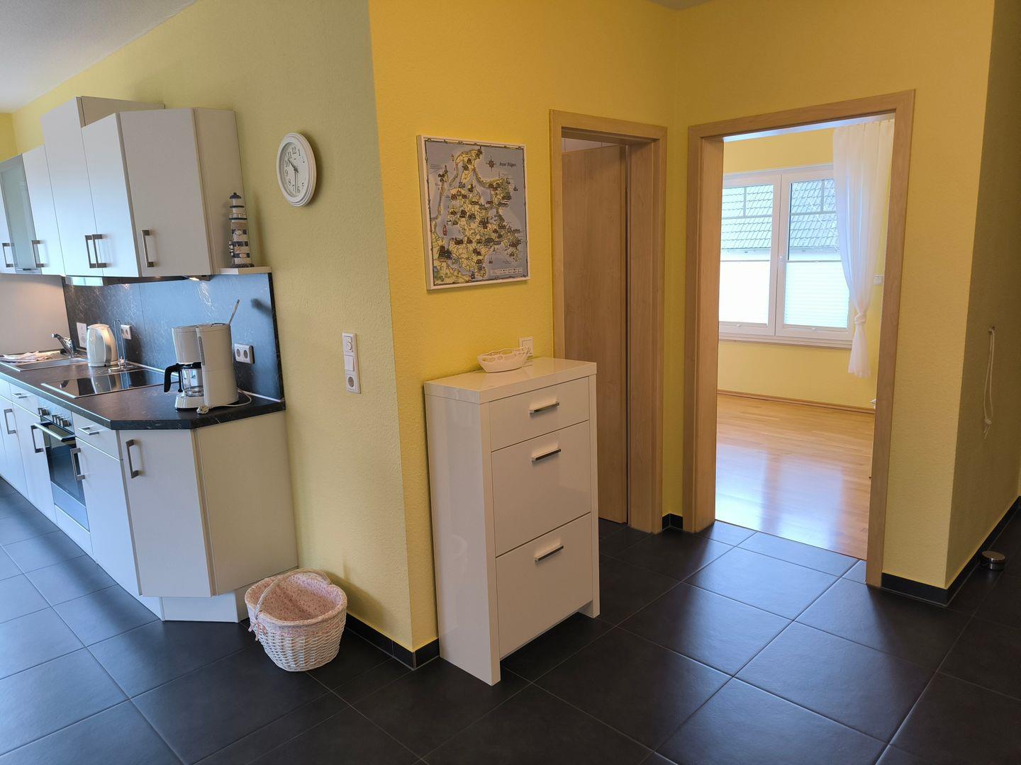 in den Wohnraum integrierte Einbauküche, ausgestattet mit: 4-Platten-Cerankochfeld, Backofen , Mikrowelle, Kühlschrank mit Gefrierfach, Geschirrspüler, Toaster, Kaffeemaschine, Wasserkocher und hochwertigen Küchenutensilien