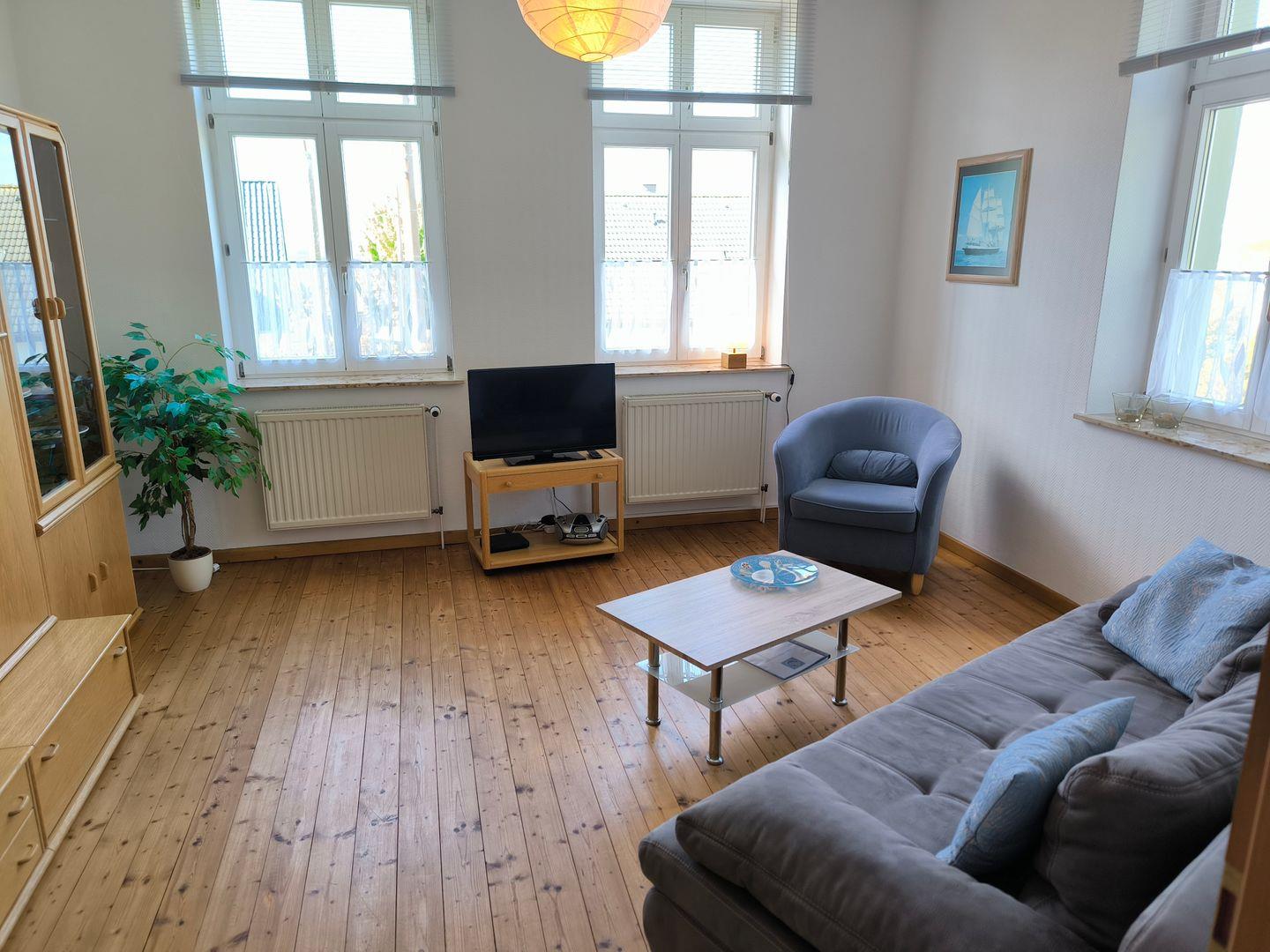 Wohnzimmer mit einer Aufbettungscouch, Couchtisch und Sesseln, Kommode mit Flat-TV, eine Wohnwand, CD-Radio, Gesellschaftsspiele
