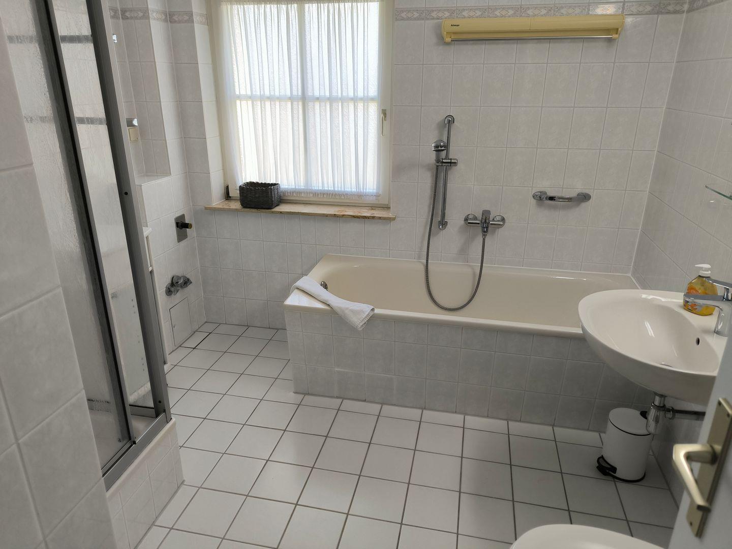 Bad mit Fenster, Dusche, Badewanne und WC