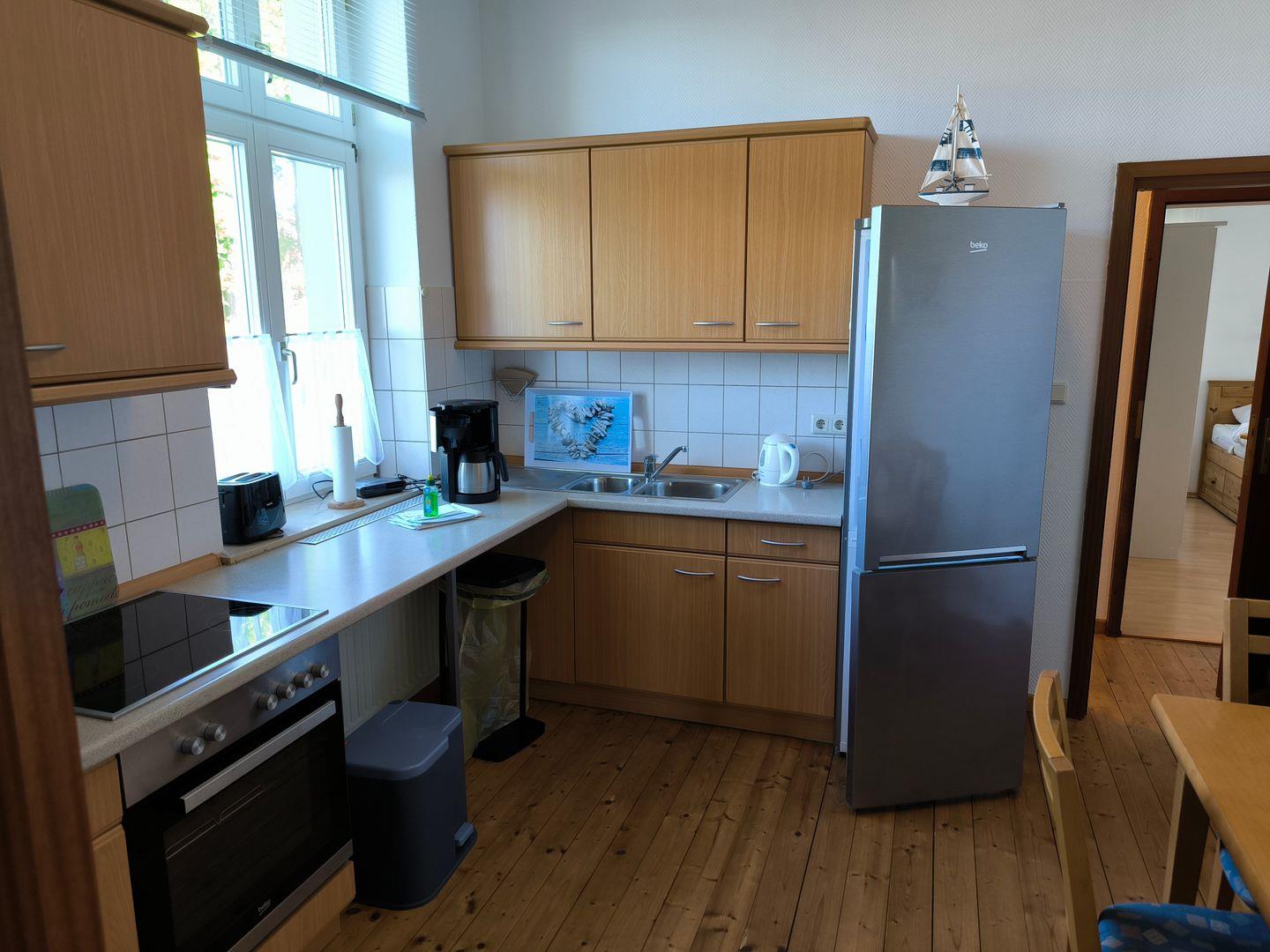separate Küche mit Einbauküche: 4-Platten-Ceran-Kochfeld, Backofen, Dunstabzugshaube, Kühl-Gefrier-Kombination, Spüle, Mikrowelle, Toaster, Kaffeemaschine, Wasserkocher, kein Geschirrspüler, diverse Küchenutensilien, Esstisch mit 2 Stühlen und Kinderhochstuhl