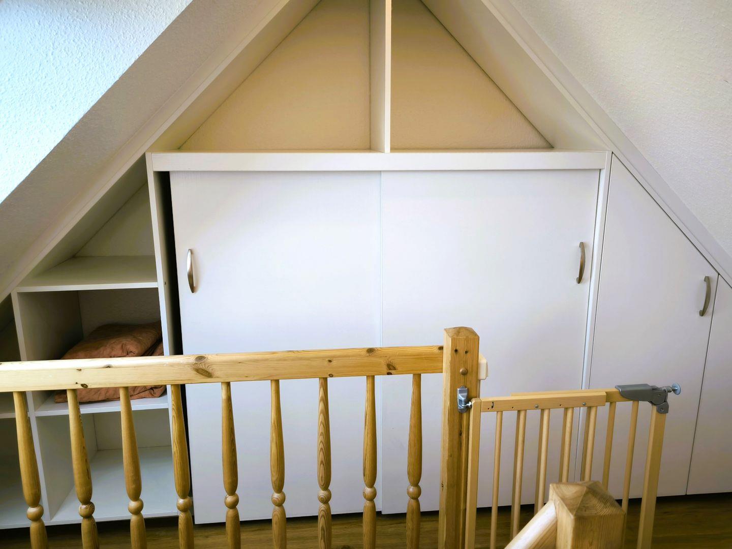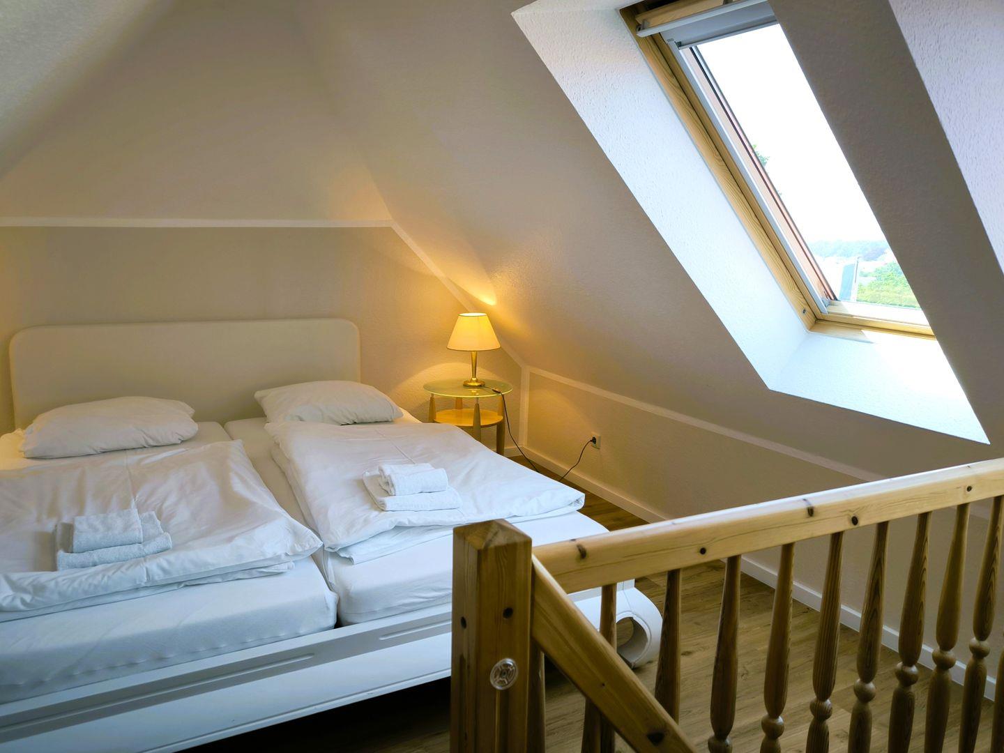 Schlafzimmer ( über eine Treppe erreichbar ) mit einem Doppelbett (180 x 200 cm), großem Kleiderschrank