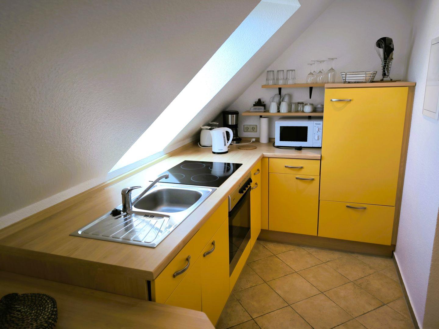 separate Küche mit 4- Platten- Kochfeld, Backofen, Kühlschrank, Toaster, Kaffeemaschine, Wasserkocher und Küchenutensilien