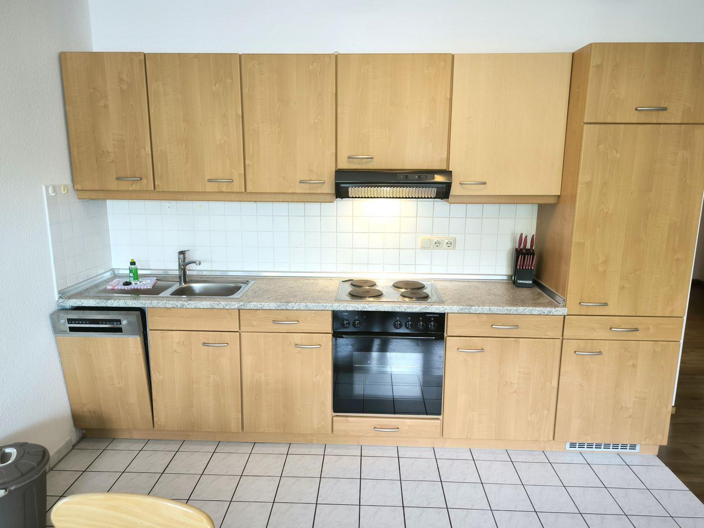Im Wohnraum integrierte Einbauküche mit: 4-Platten-Kochfeld, Backofen, Kühlschrank mit Gefrierfach, Geschirrspüler, Toaster, Kaffeemaschine, Wasserkocher und Küchenutensilien