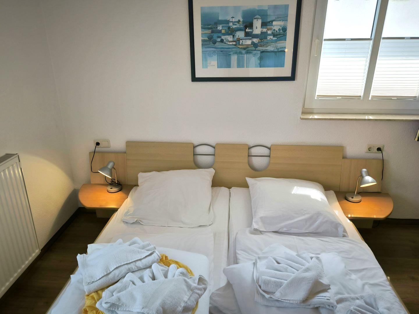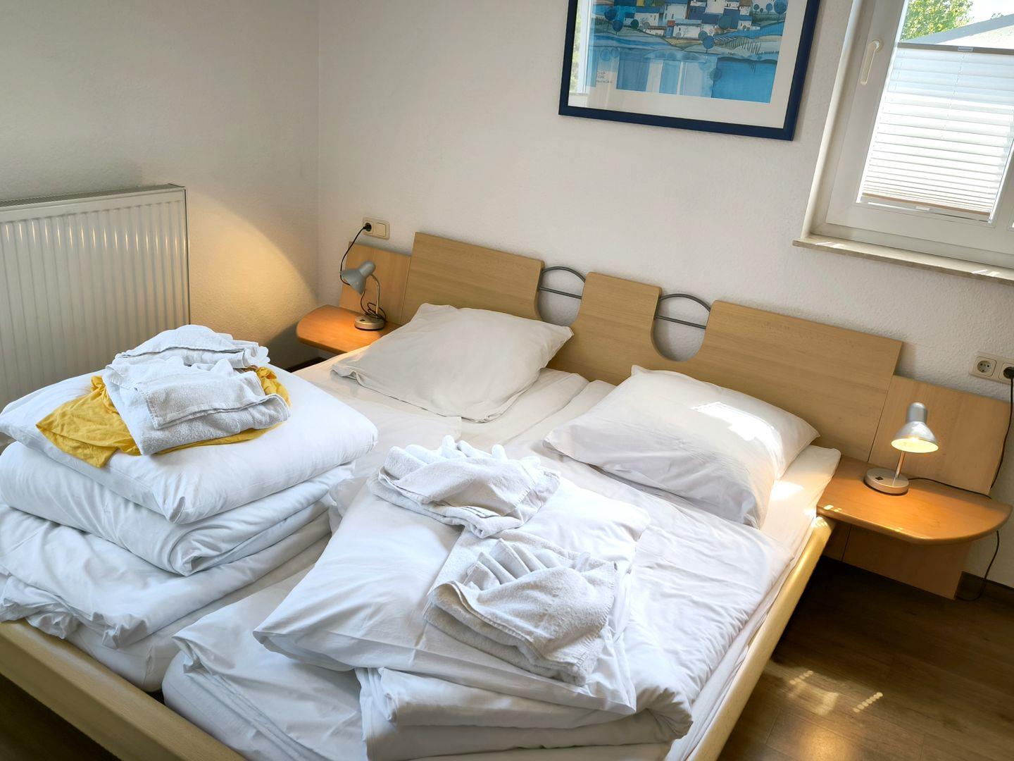 Schlafzimmer mit einem Doppelbett (180 x 200 cm) und großem Kleiderschrank, Kofferablage