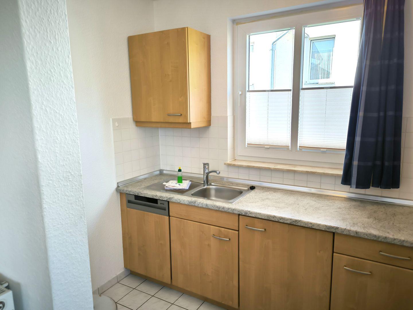 Im Wohnraum integrierte Einbauküche mit: 4-Platten-Kochfeld, Backofen, Kühlschrank mit Gefrierfach, Geschirrspüler, Toaster, Kaffeemaschine, Wasserkocher und Küchenutensilien