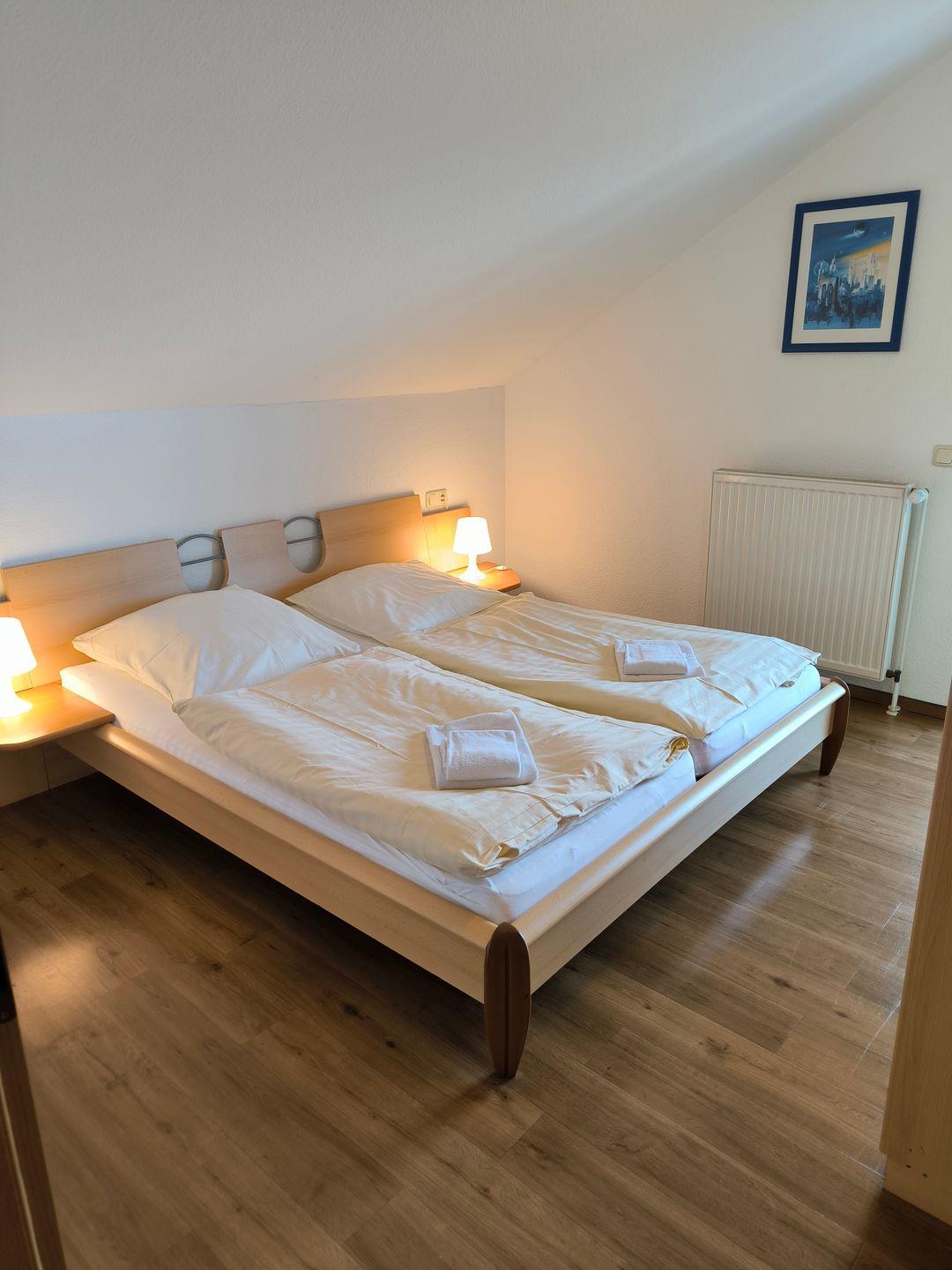 Schlafzimmer mit einem Doppelbett (180 x 200 cm) und großem Kleiderschrank, Kofferablage