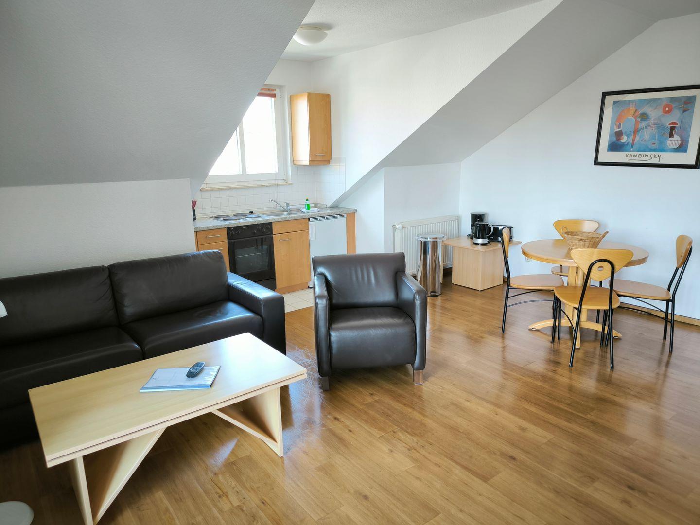 Wohnbereich mit ausziehbarer, moderner Doppelbettschlafcouch, Couchtisch mit Sesseln, Flat-TV mit Radiofunktion ,Esstisch mit 4 Stühlen