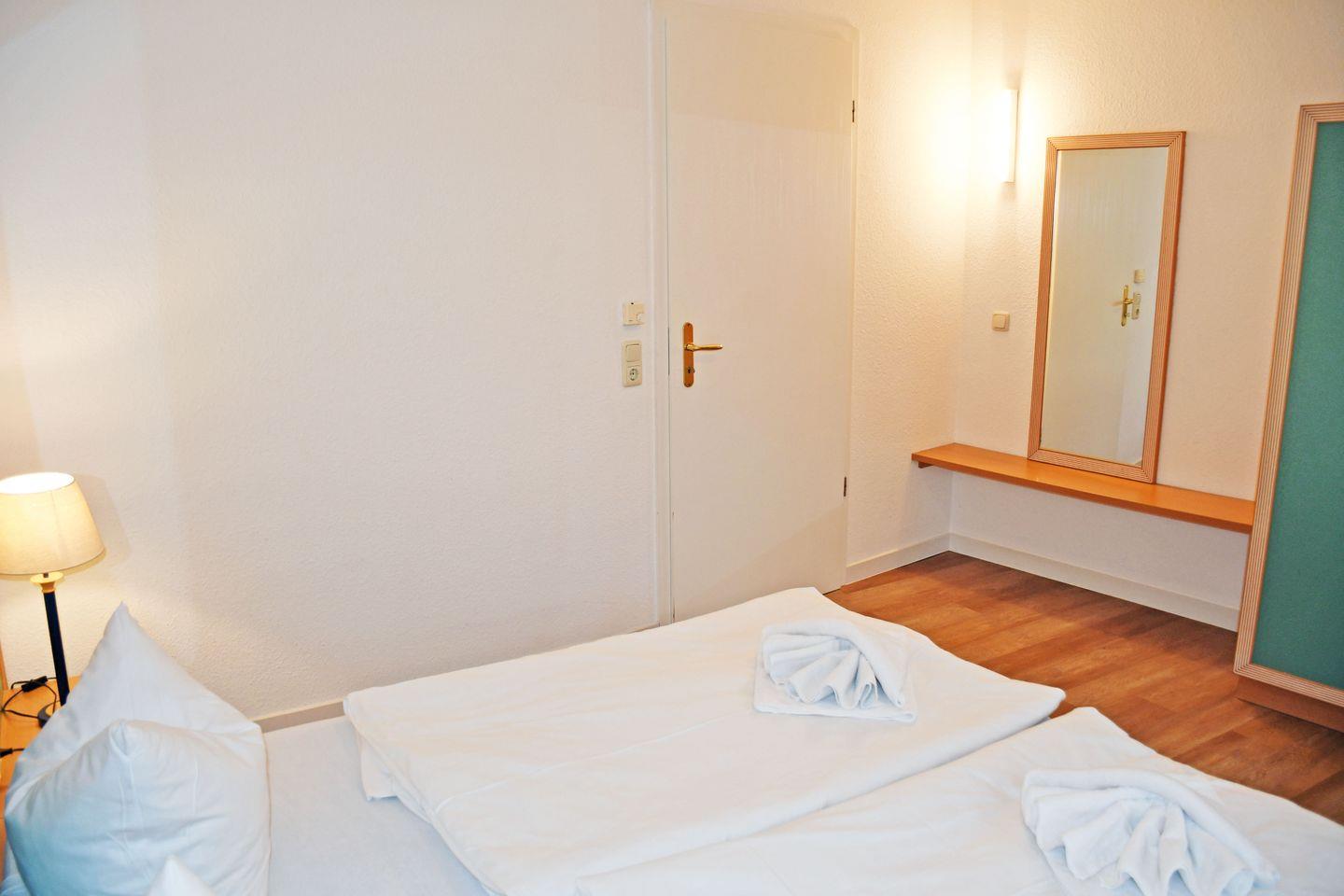 Schlafzimmer mit einem Doppelbett (180 x 200 cm), großem Kleiderschrank