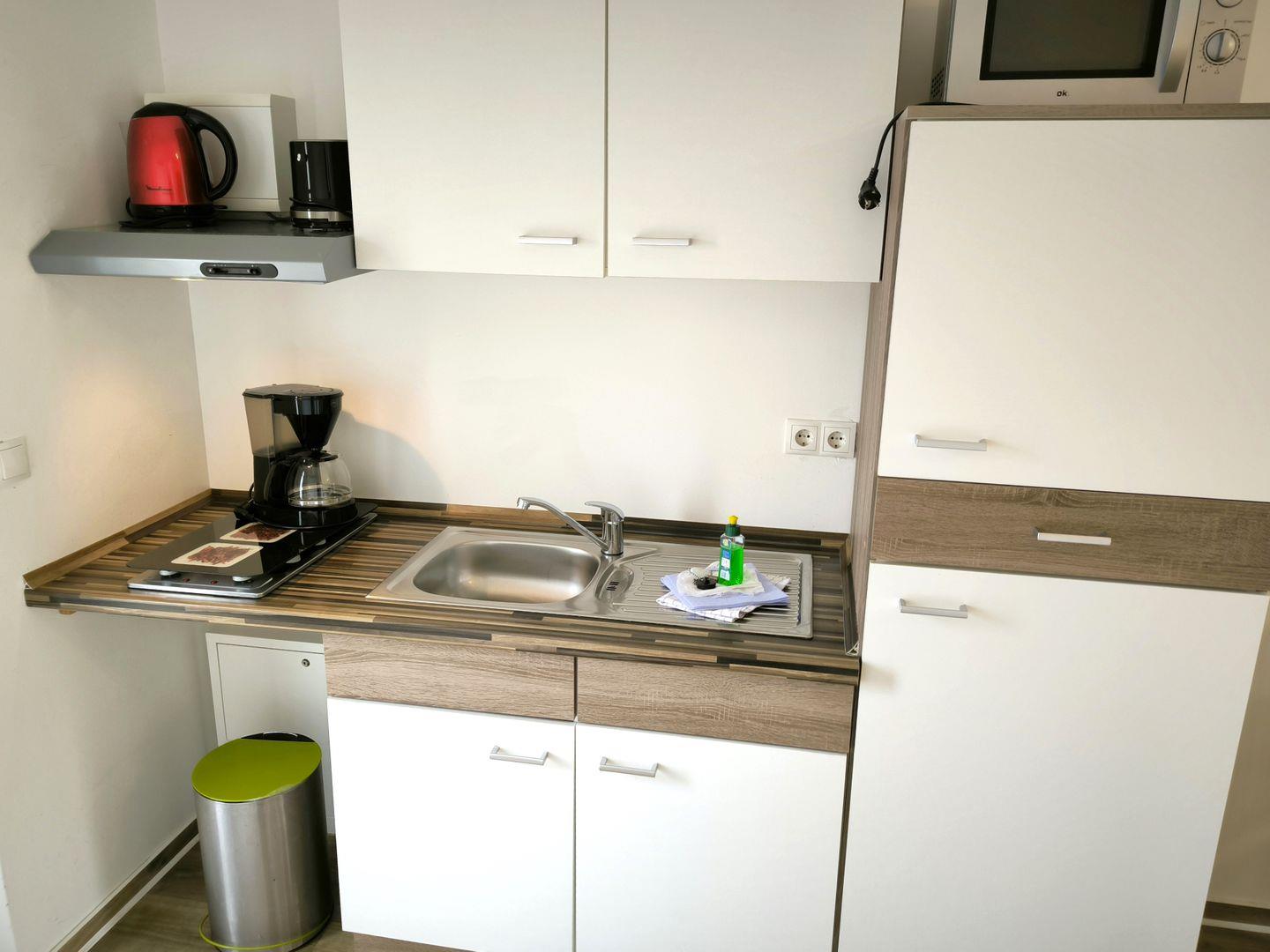 kleine integrierte Küchenzeile mit 2-Platten-Kochfeld, Backofen, Kühlschrank mit Gefrierfach, Mikrowelle, Toaster, Kaffeemaschine, Wasserkocher, diverse Küchenutensilien