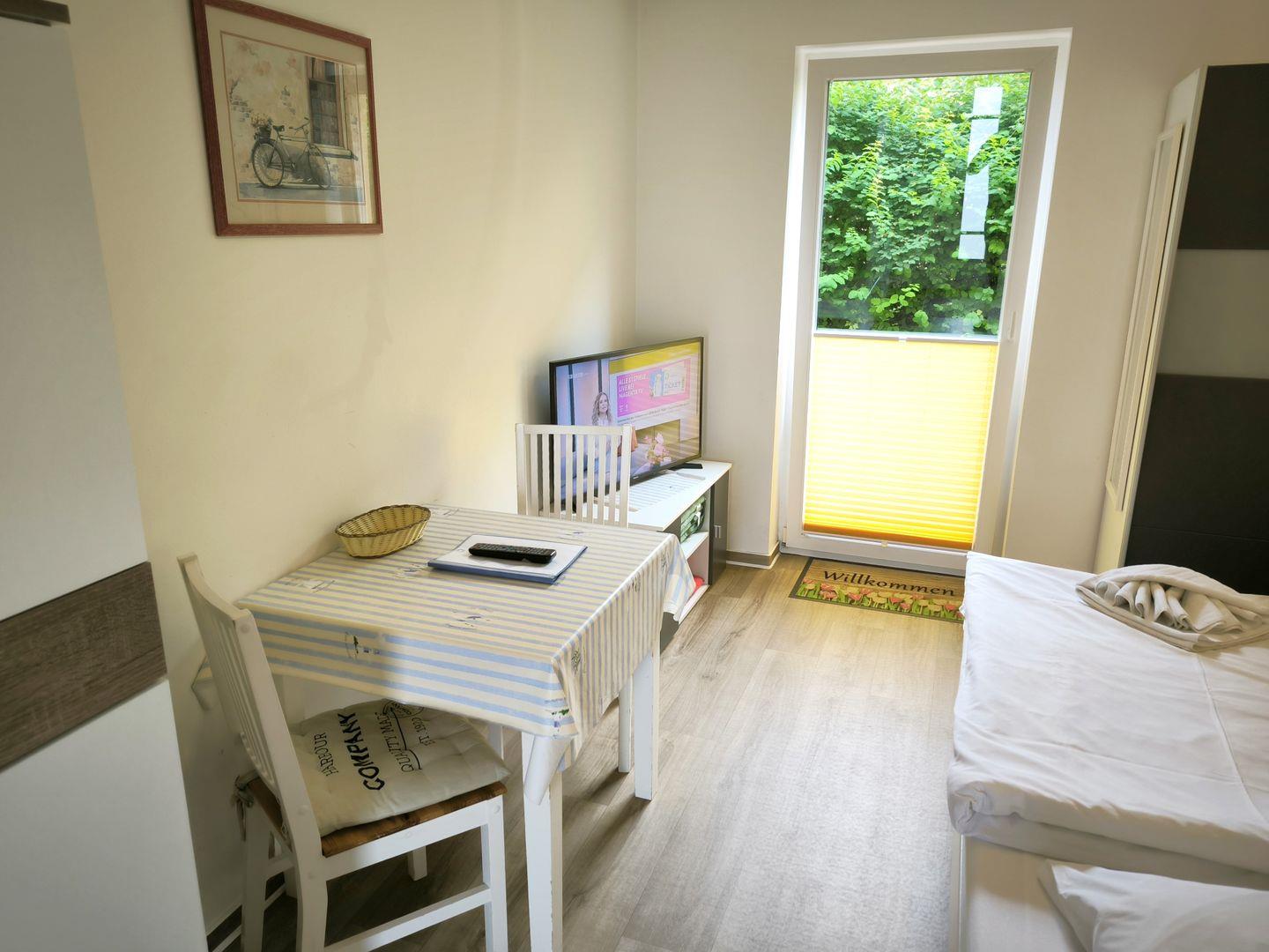 kombinierter Wohn-/ Schlafbereich mit Doppelbett ( 180×200 ) und Esstisch mit 2 Stühlen