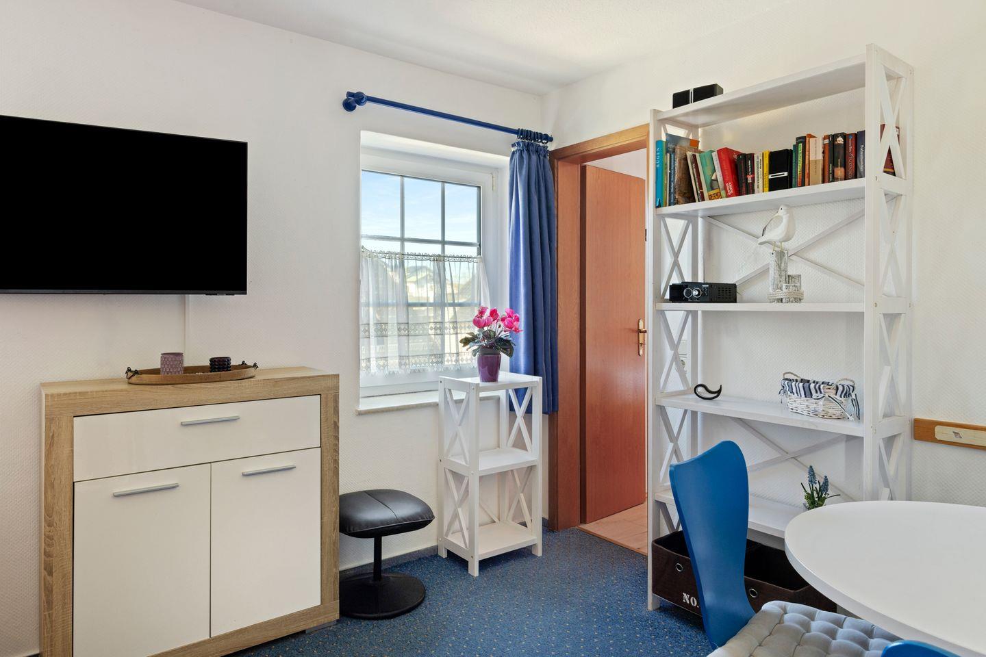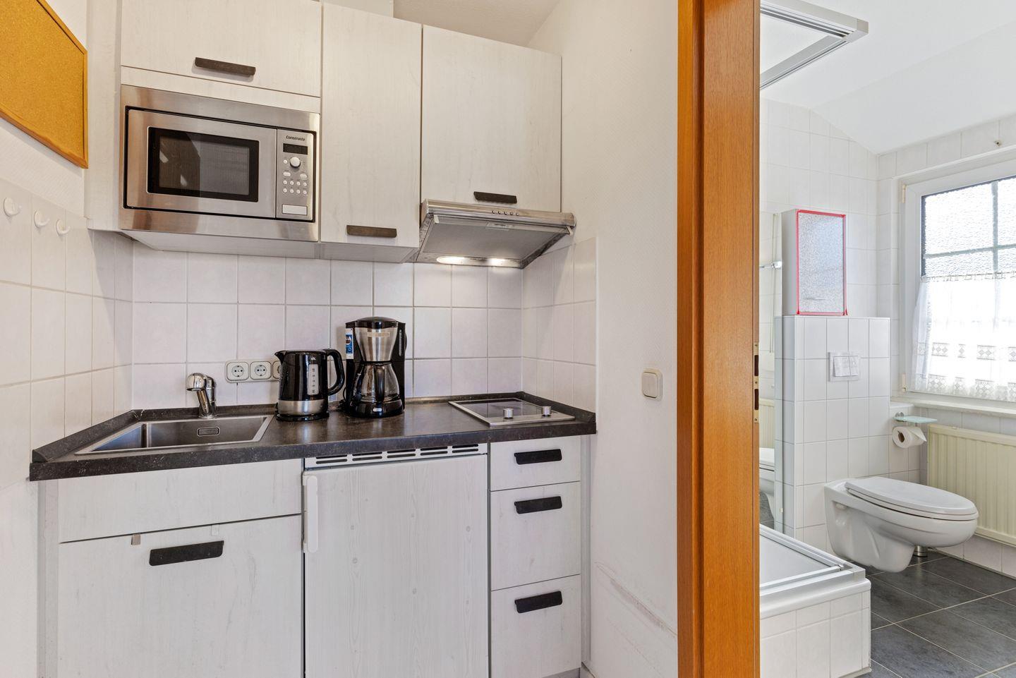 Der Wohnbereich ist offen mit der Küche verbunden und schafft eine freundliche, gut nutzbare Raumaufteilung. Zur Ausstattung gehören eine Sofaecke, ein Esstisch, TV mit digitalem Anschluss sowie WLAN. Die offene Küche ist mit einem 2-Platten-Herd, Kühlschrank mit Gefrierfach, Mikrowelle, Kaffeemaschine, Toaster, Wasserkocher, Küchenutensilien sowie Geschirr und Besteck ausgestattet und bietet alles, was Sie für die unkomplizierte Selbstversorgung benötigen.