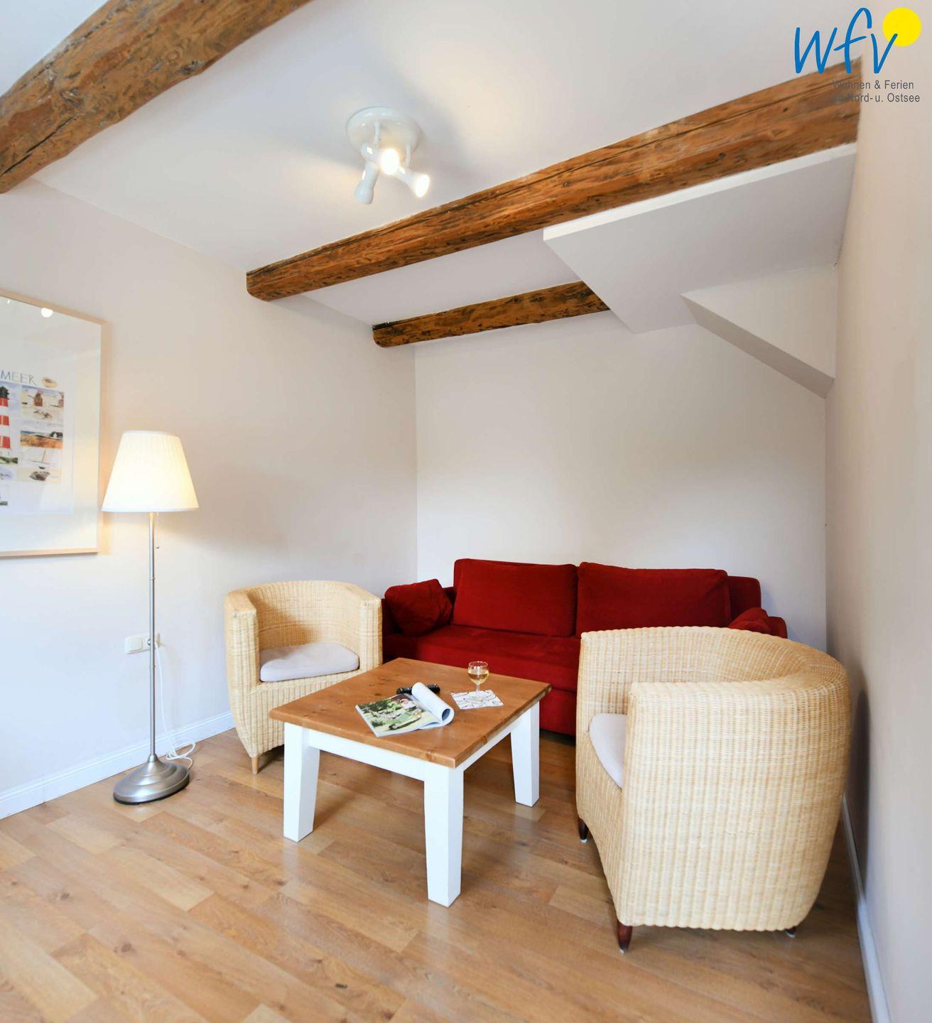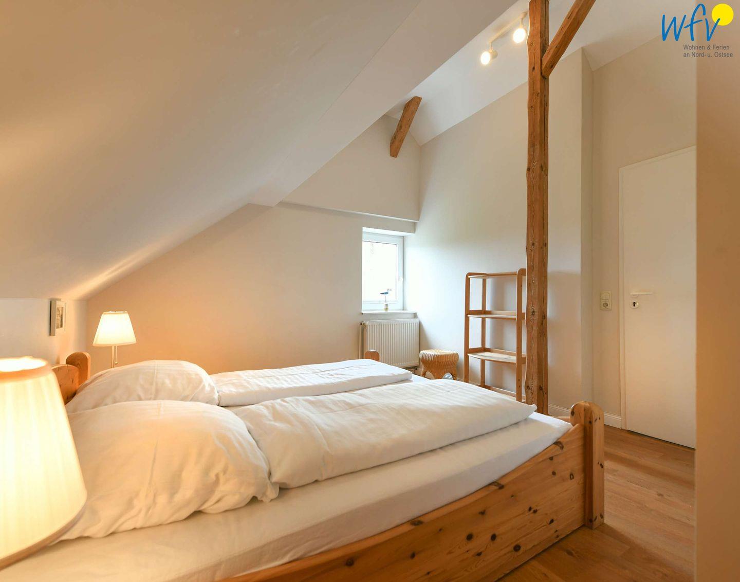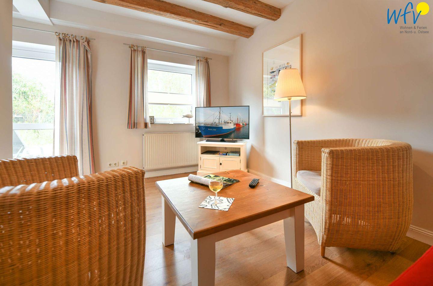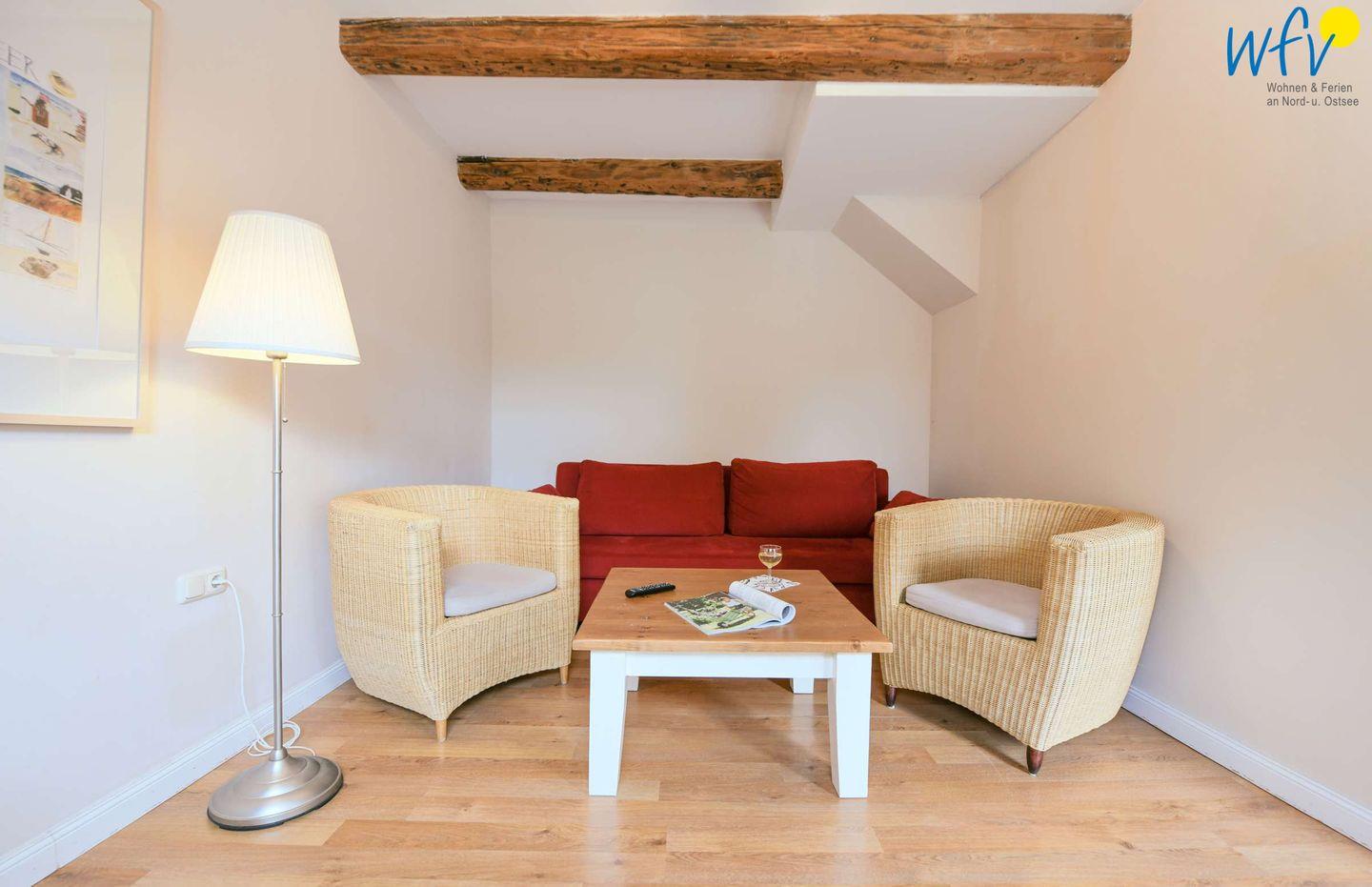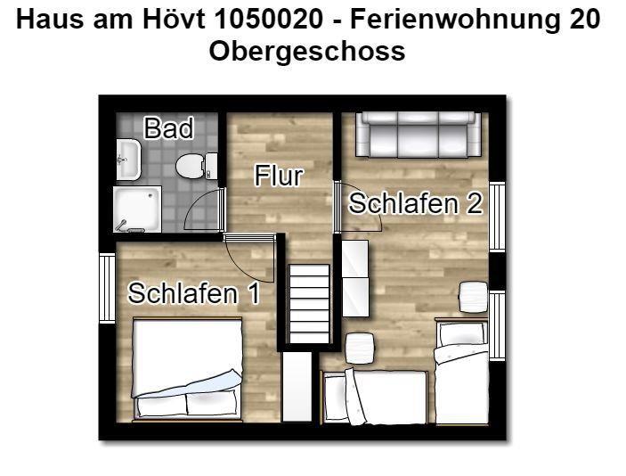 Im Erdgeschoss erwartet Sie ein Wohnraum mit gemütlicher Couchecke, Sesseln und modernem TV sowie eine Küche mit Essbereich. Im Obergeschoss befinden sich zwei separate Schlafzimmer, die mit einem Doppelbett (1,80 m x 2 m) bzw. zwei Einzelbetten (0,90 m x 2 m) ausgestattet sind. Eine Aufbettung ist möglich (auf Anfrage).
