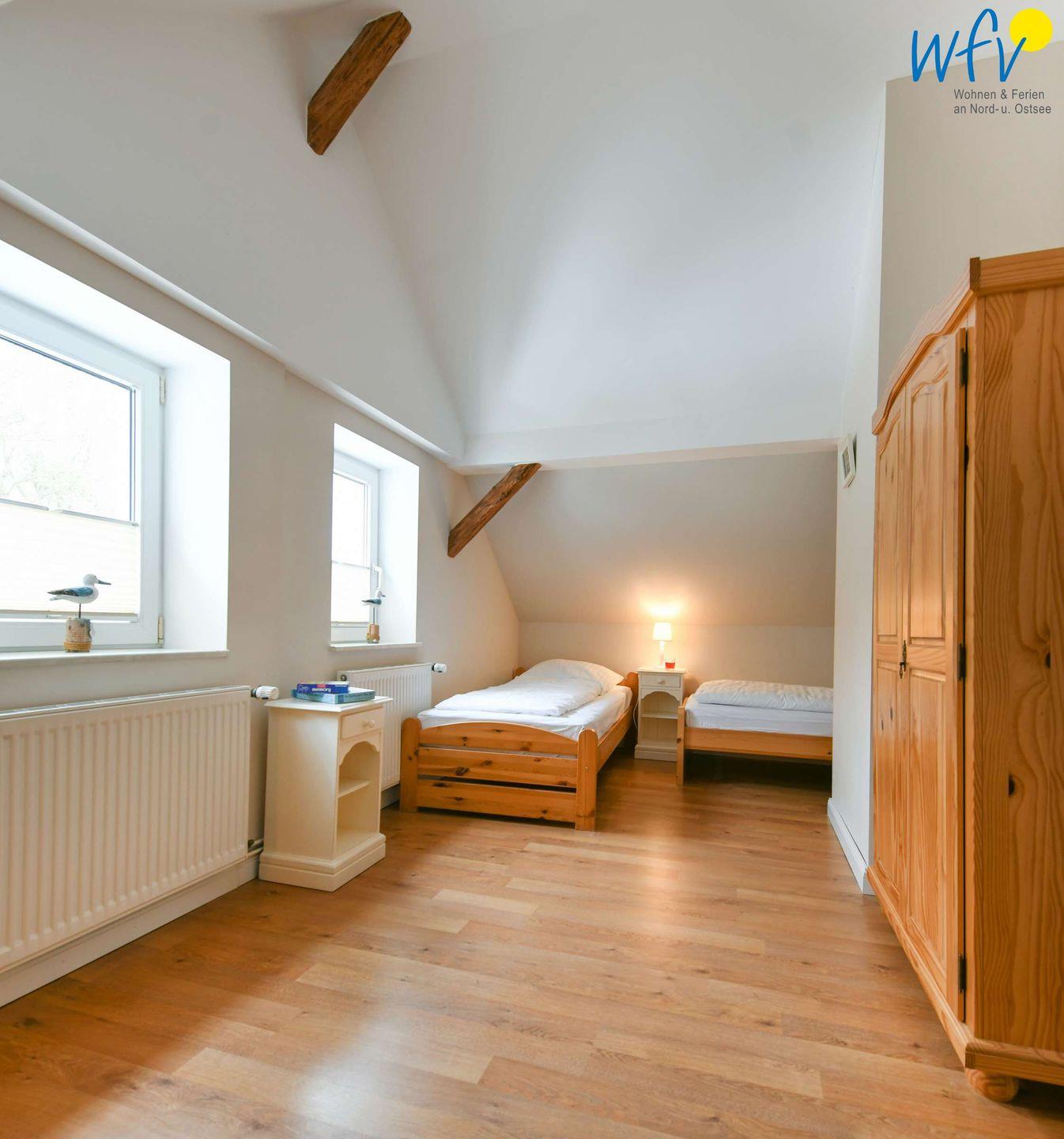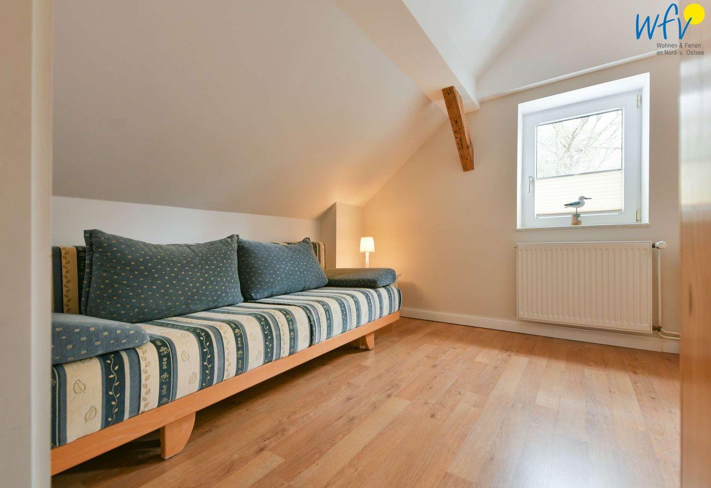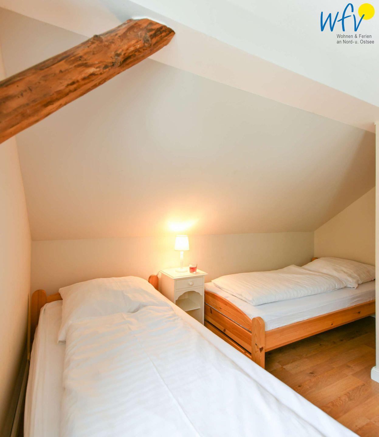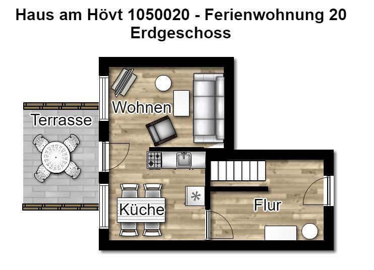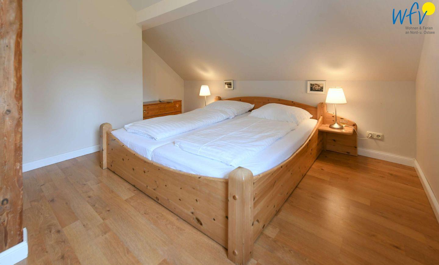 Im Erdgeschoss erwartet Sie ein Wohnraum mit gemütlicher Couchecke, Sesseln und modernem TV sowie eine Küche mit Essbereich. Im Obergeschoss befinden sich zwei separate Schlafzimmer, die mit einem Doppelbett (1,80 m x 2 m) bzw. zwei Einzelbetten (0,90 m x 2 m) ausgestattet sind. Eine Aufbettung ist möglich (auf Anfrage).